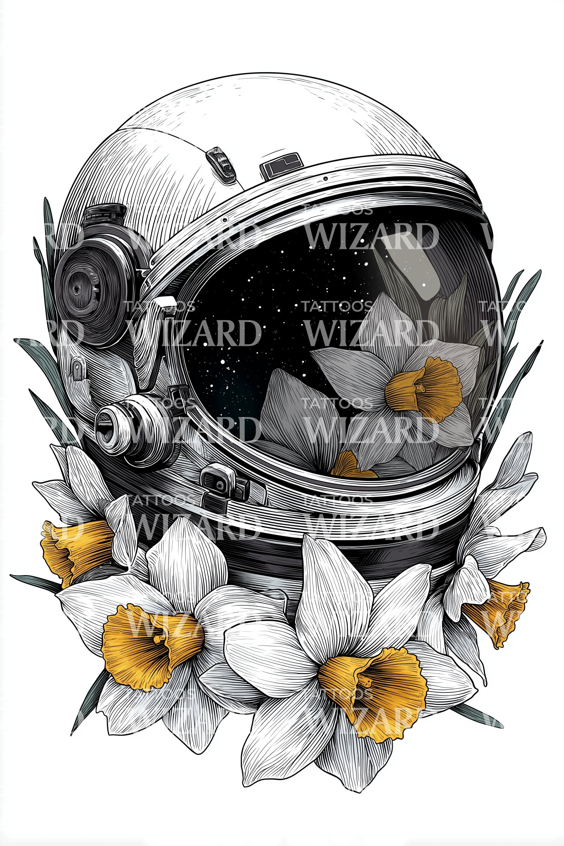 Immergiti nel cosmo con il nostro design di tatuaggio neotradizionale. Con una rappresentazione illustrativa ricca di colori di un astronauta tra i narcisi, combina la serenità della natura con l'emozione dell'esplorazione spaziale. Questo design utilizza il casco per incorniciare la scena, creando un effetto drammatico. Un pezzo davvero unico e distintivo!