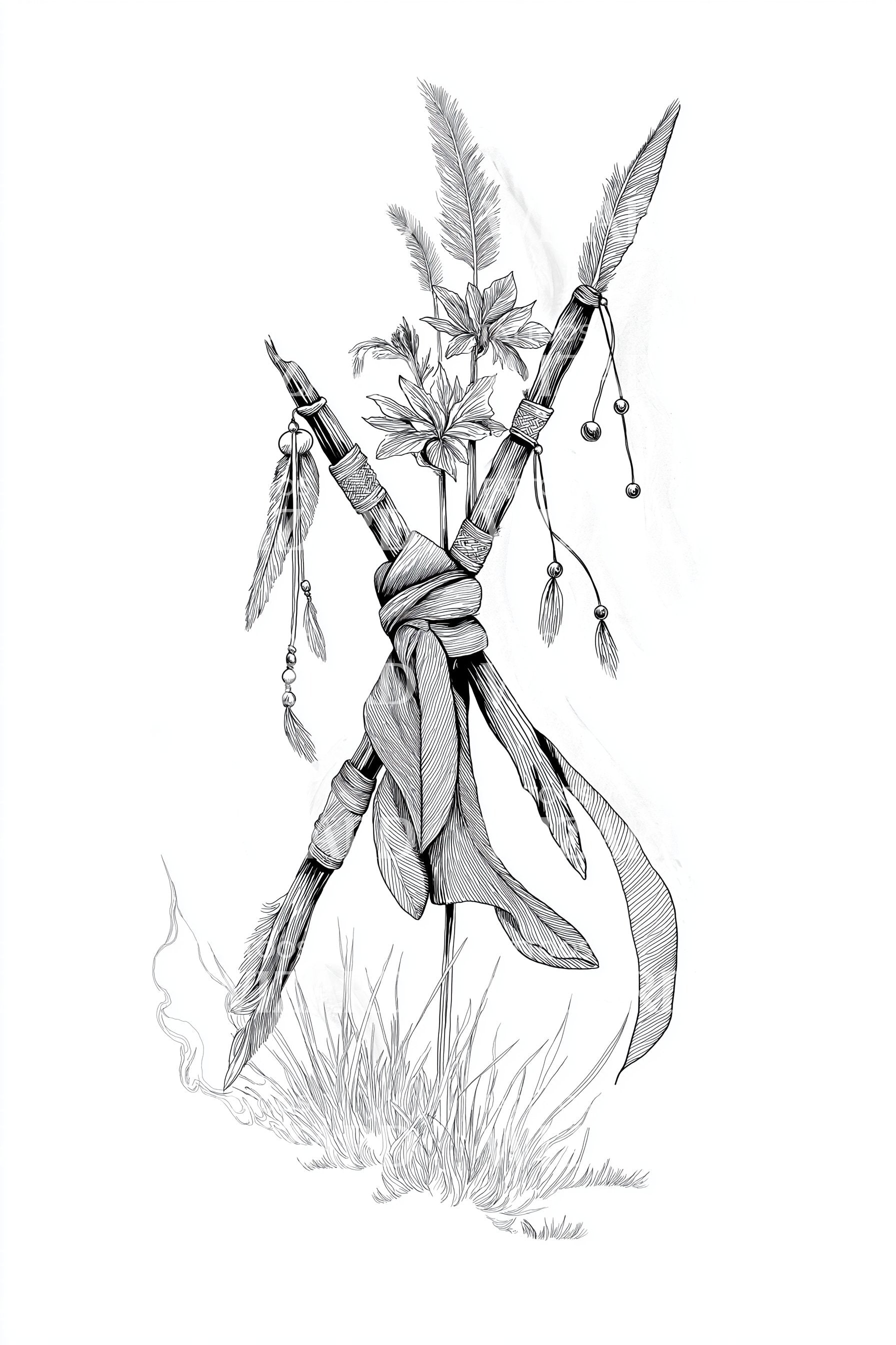 Ceremonial tripod of bound sticks rises in fine ink, ribboned knots, bead strands, and drifting feathers beside sprigs of medicine plants. The structure honors gatherings, balance, and ancestral spirit, a portable altar of intent. Wearing it feels grounded yet uplifted, tribal heartbeat steady, courage and clarity whispering.