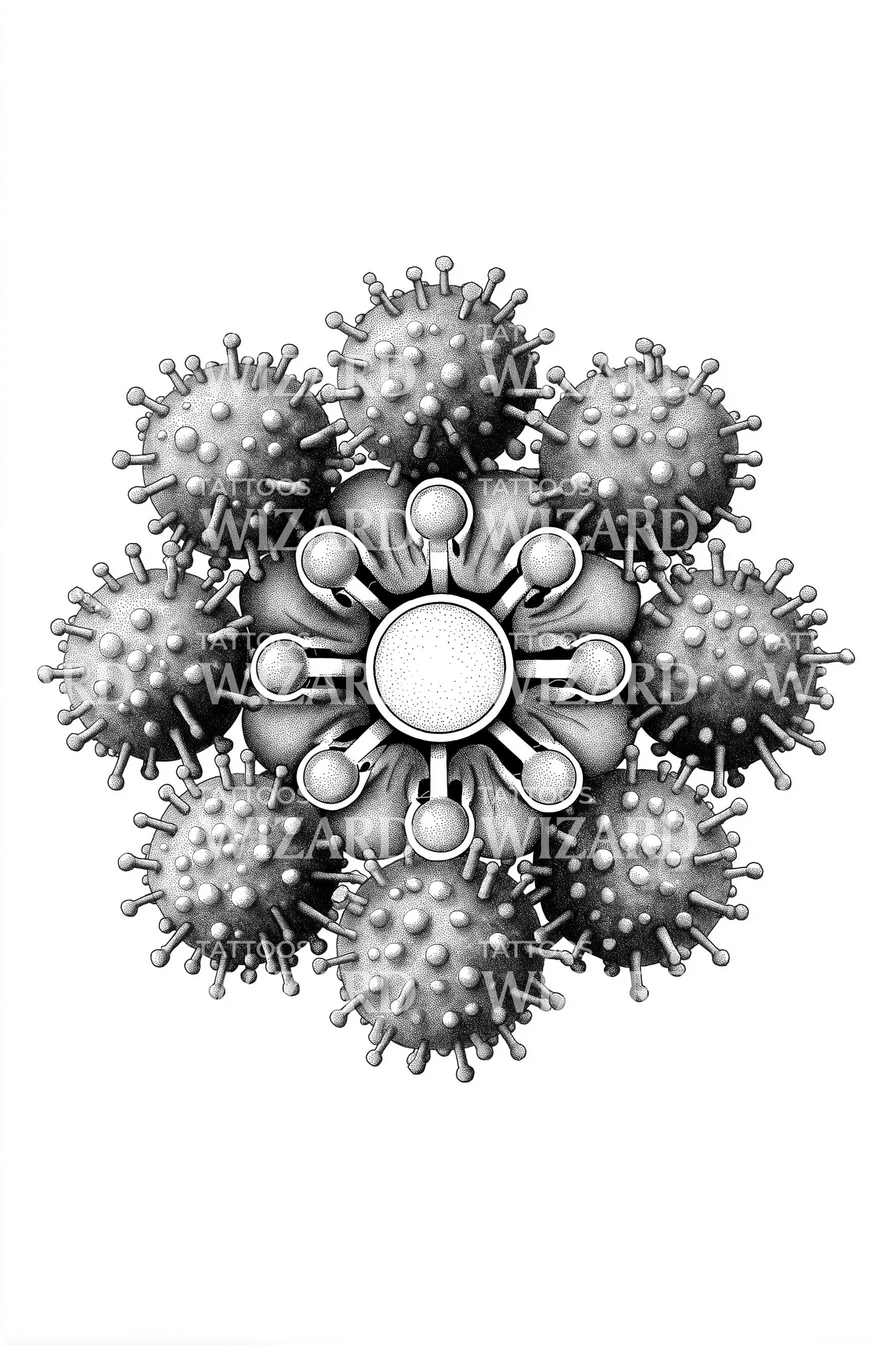 Radial spores bloom into dotwork symmetry, a reminder that even what threatens can teach devotion to the center. Drawn to those who transmute fear into focus, who claim an organic resilience no one can disinfect. In the hush of decay, your life learns to flower.