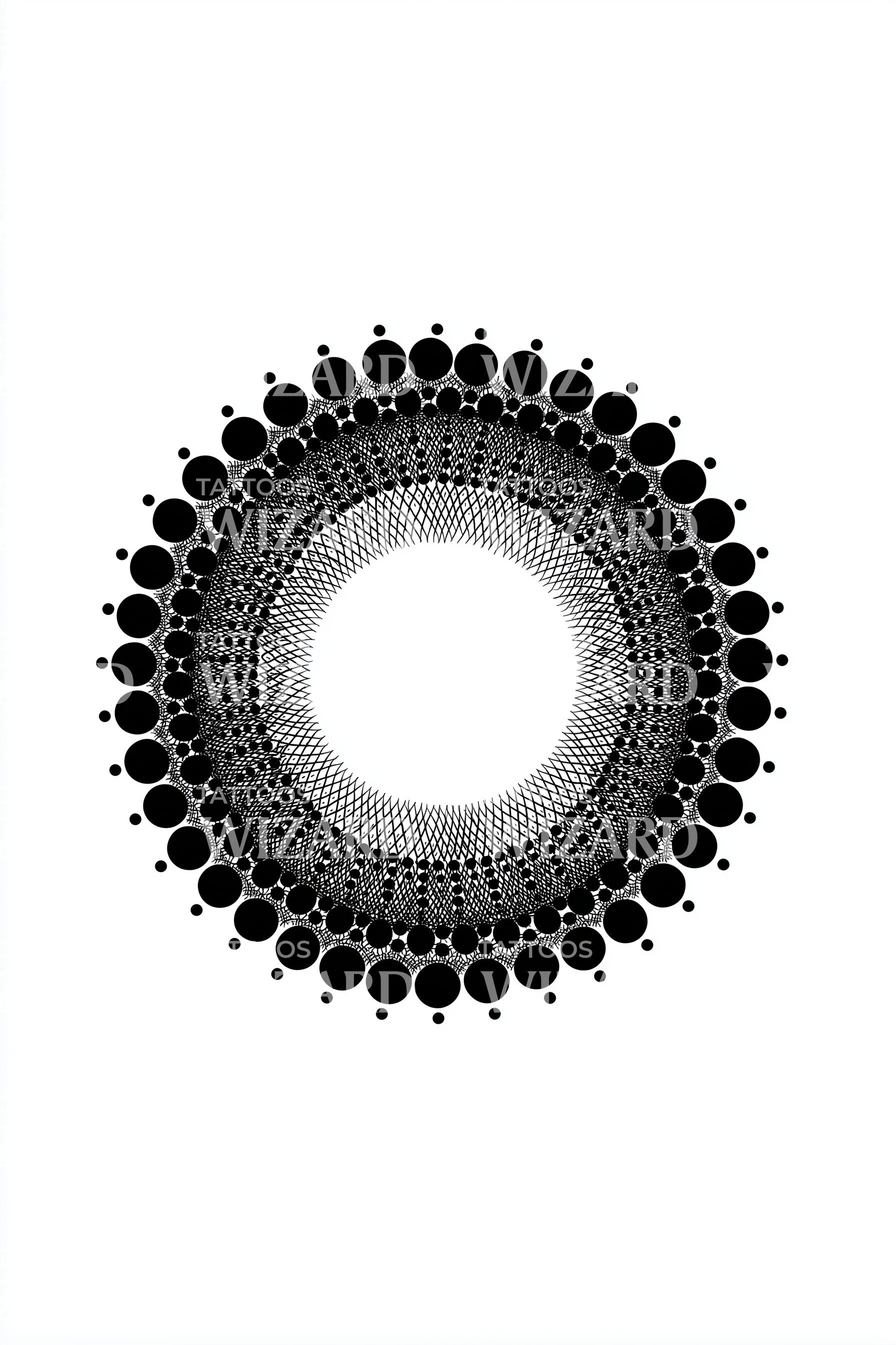 Questo intricato disegno di tatuaggio dotwork mette in mostra la bellezza del cosmo in un motivo ad anello a halo stellare. Irradiando vibrazioni spaziali, racchiude l'immenso e celestiale ignoto, fondendo perfettamente l'arte con la meraviglia eterea. Ideale per chi desidera portare sempre con sé un frammento dell'universo.