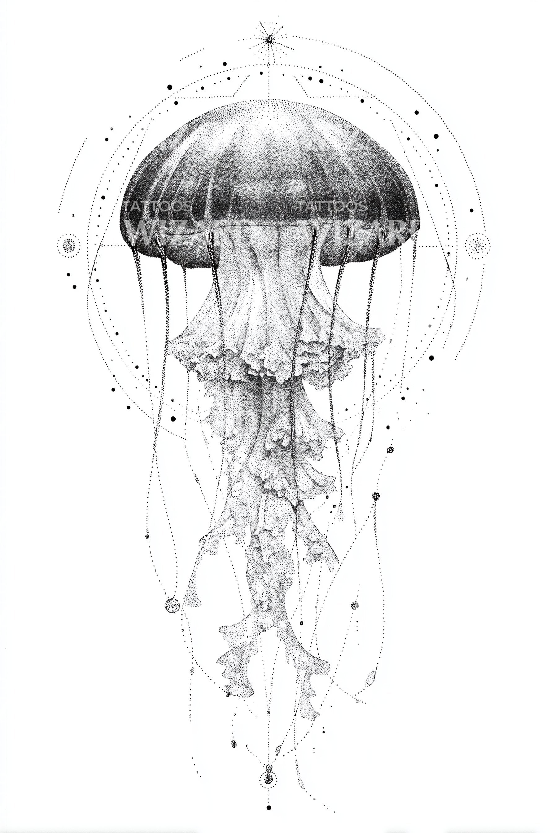 Jellyfish drifting through the ocean of your own becoming, each stipple a breath taken after surviving the undertow. Dotwork turns softness into resolve, marine patience into forward flow. For the quiet storm who trusts intuition. A constellation learns to swim, and you follow.