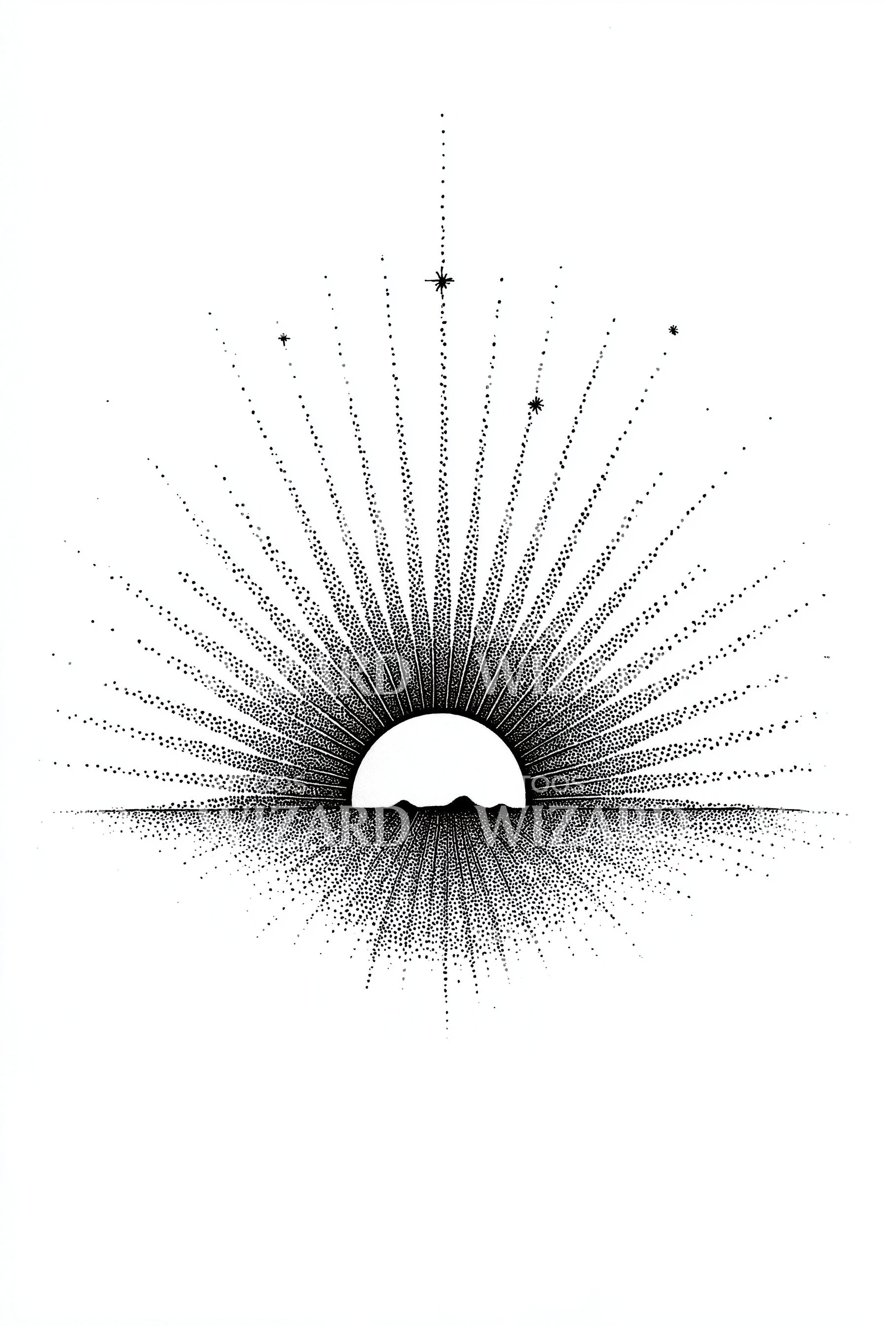 Rising sun in meticulous blackwork, a half-orb lifting over a fine horizon as dotted rays burst outward into tiny guiding stars. The dawn symbolizes light after shadow, hope, and a new beginning. Wearing it feels like breathing in first light, steady, radiant, quietly unstoppable, for daily renewal.