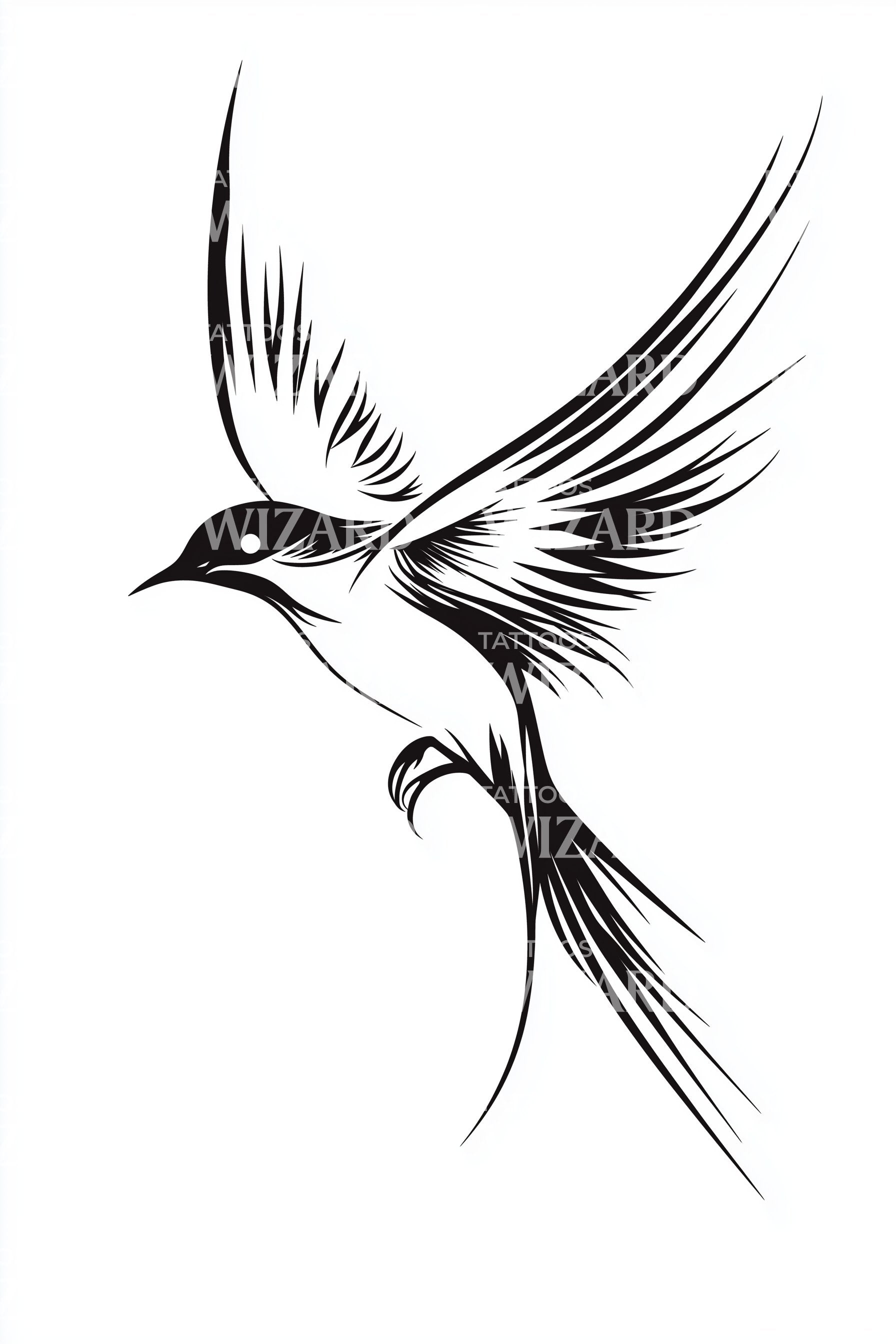 Concediti l'eleganza senza tempo del nostro design di tatuaggio fineline che raffigura una graziosa rondine in volo. I dettagli intricati delle ali rappresentano un omaggio classico al volo e all'aria, creando una sensazione di fluidità e libertà. Perfetto per chi cerca un tatuaggio raffinato e attento ai dettagli.