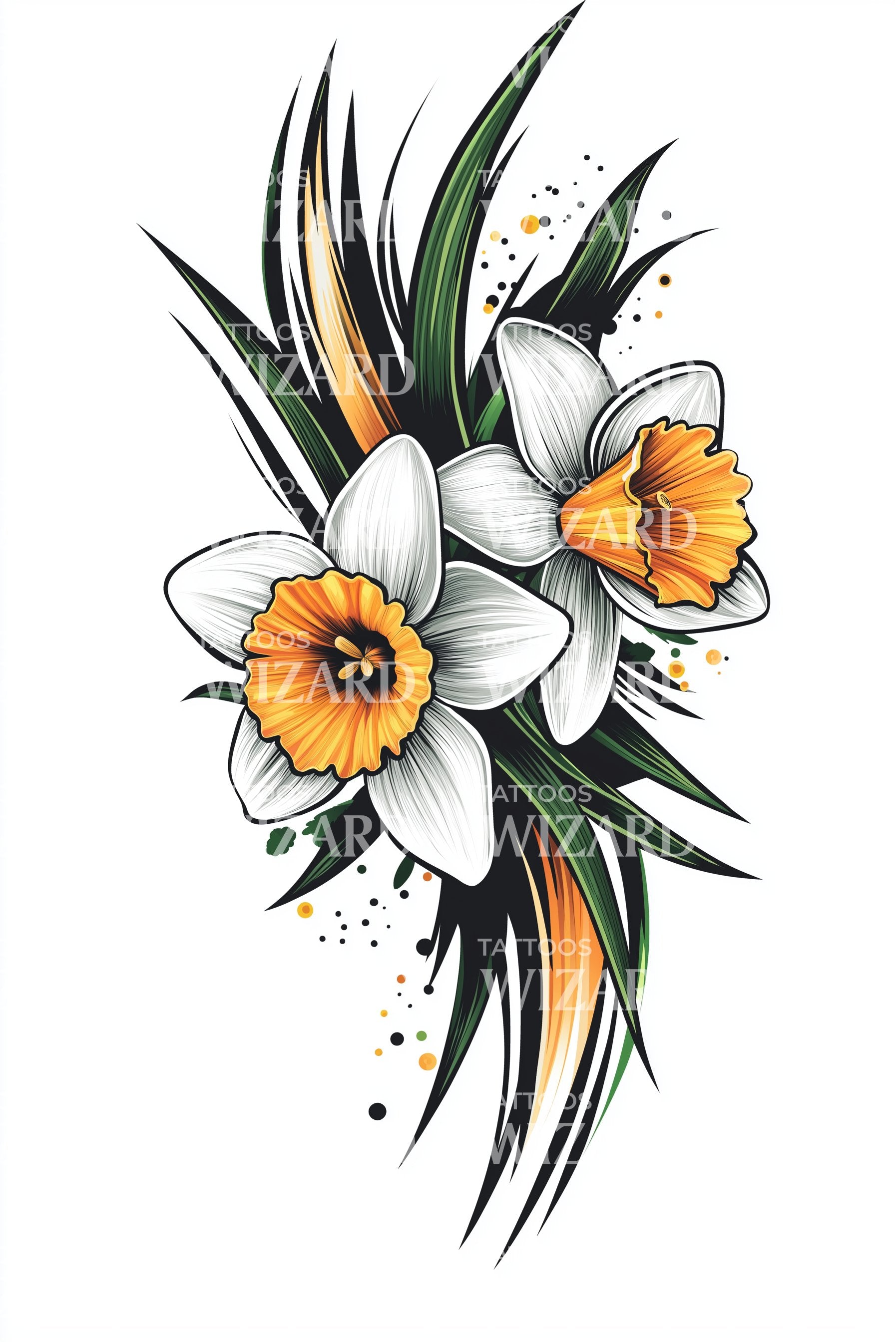 Presentiamo un sorprendente disegno di tatuaggio neotradizionale che abbraccia la bellezza dei colorati Narcisi. Abilmente realizzato per rappresentare un flusso dinamico, il disegno è arricchito da foglie rigogliose che formano un bouquet affascinante. Questa composizione vibrante è una celebrazione dell'individualità e della passione artistica.