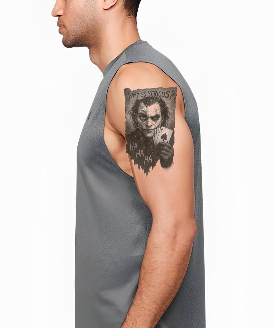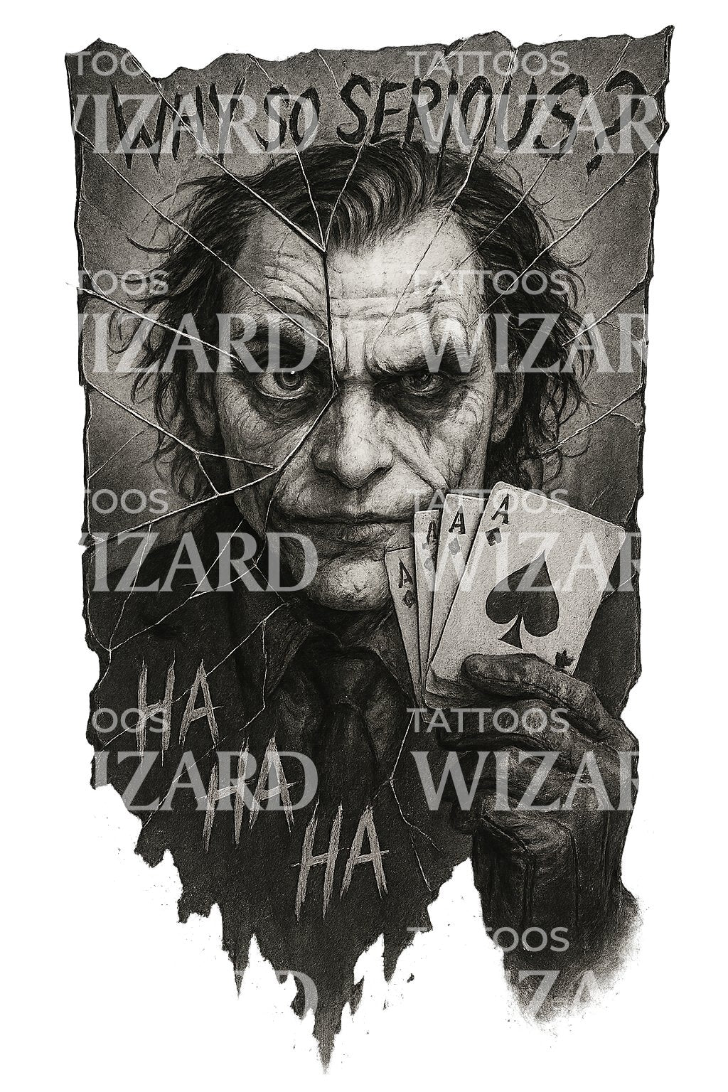 Scatena il tuo lato selvaggio con il nostro design di tatuaggio Joker in stile grunge e inchiostro. Inondato di colori vivaci, questa illustrazione ispirata ai fumetti strappati irradia caos. Ridi di fronte alla normalità con il nostro piccolo dettaglio 'Ha-Ha'. Perfetto per chi ama mostrare il proprio spirito unico e ribelle.