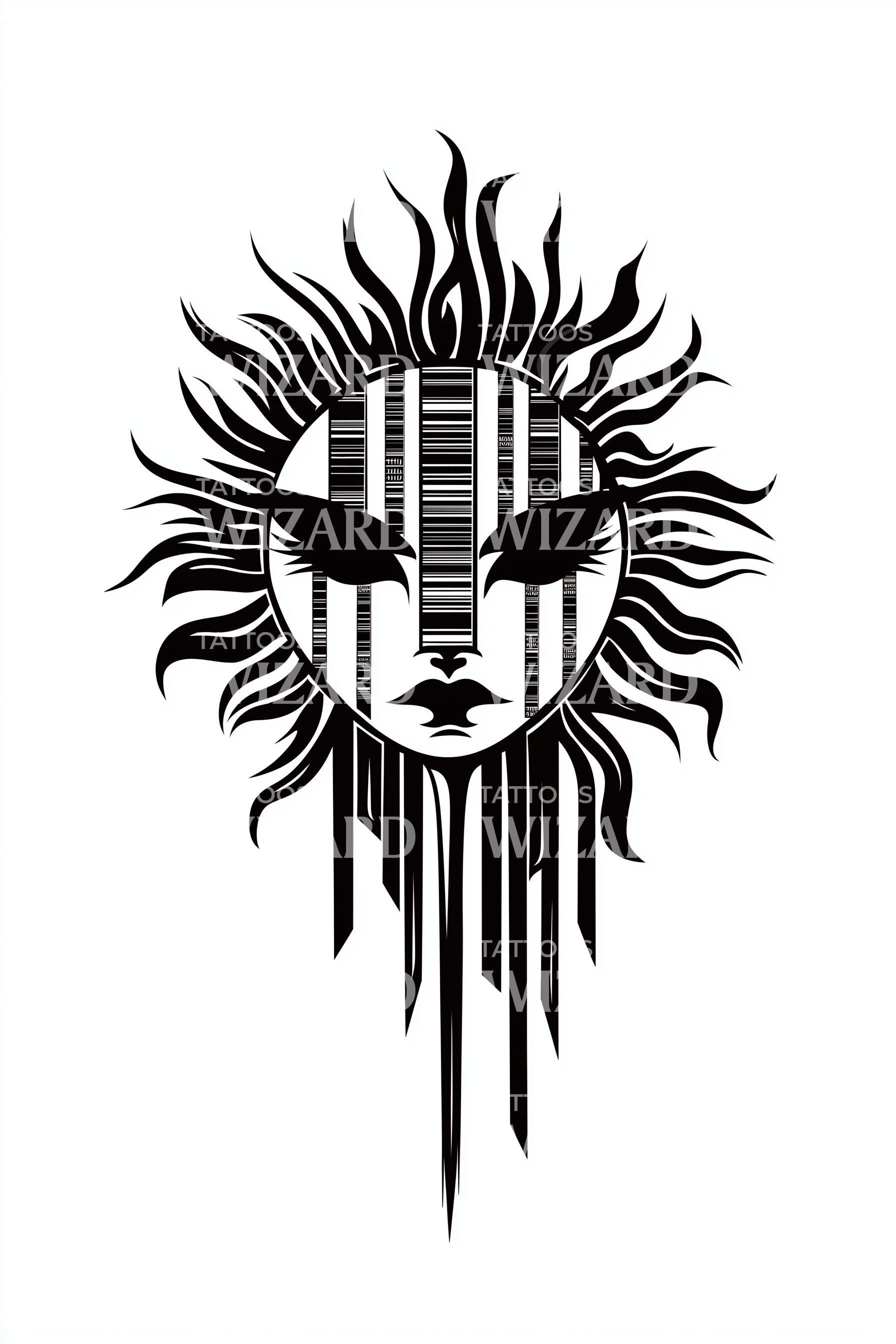 Tribal sun-face rises in bold black, a sacred mask ringed by flame-like rays, with barcode columns and dripping lines defining fierce eyes and lips. Symbol of identity and sovereignty, balancing shadow and light. Wearer feels protected, radiant, and untamed, carrying steady warmth, resilience, and awakening from within.