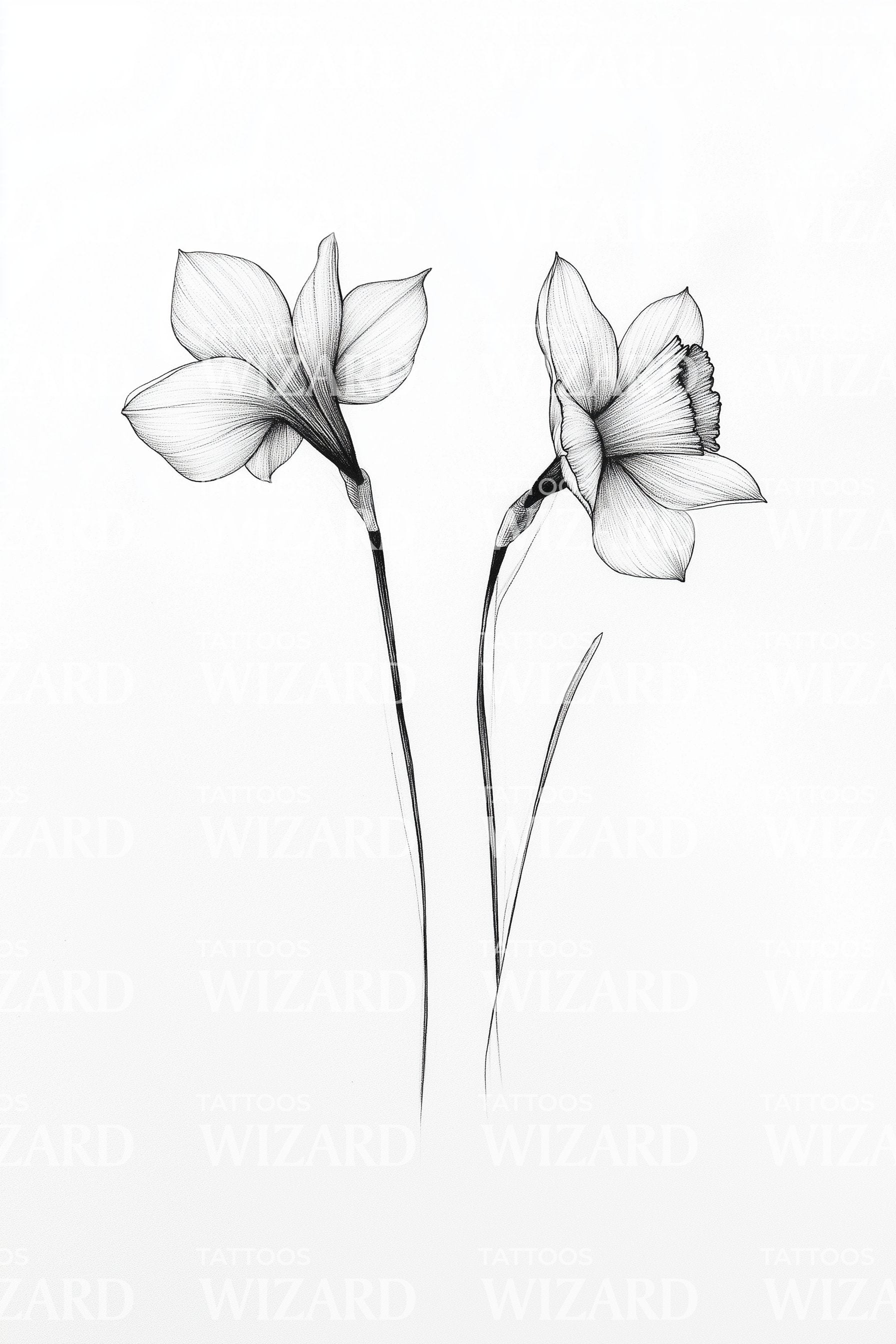 Concediti l'unione unica di semplicità ed eleganza con questo disegno di tatuaggio fineline. Presenta due narcisi gemelli, realizzati in uno stile minimalista e raffinato, che esaltano il fascino botanico. Emana un fascino delicato, questo disegno di tatuaggio aggiunge un tocco morbido e artistico alla tua persona.
