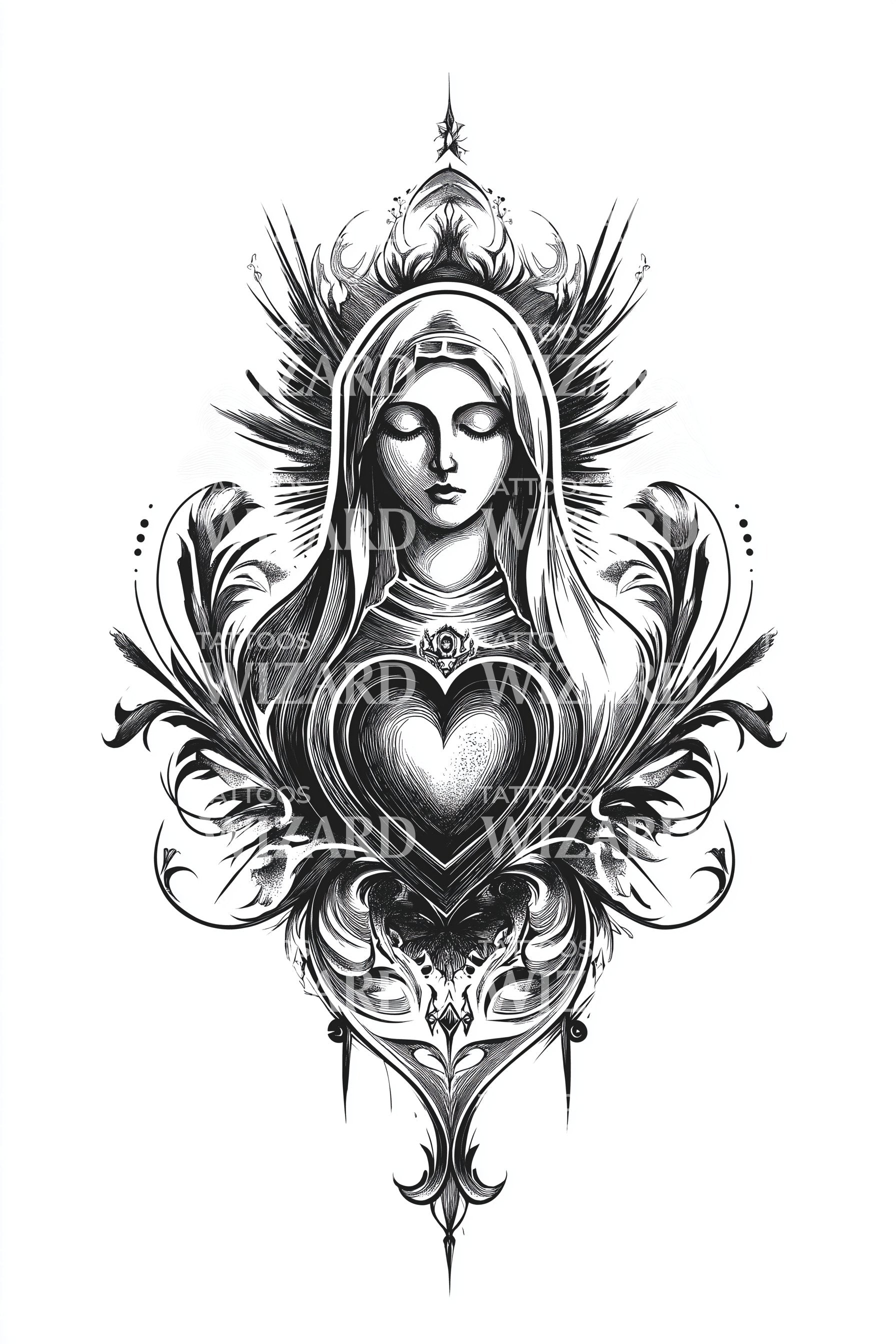 Vivi la grazia divina con questo disegno di tatuaggio in bianco e nero, che ritrae una santa vergine immersa nella luce. Il design unisce magnificamente elementi ispirati alla fede con un'elegante arte, l'aureola che dimostra riverenza. Non è solo un tatuaggio, è un'affermazione della tua fede e del tuo amore per la grazia eterna.