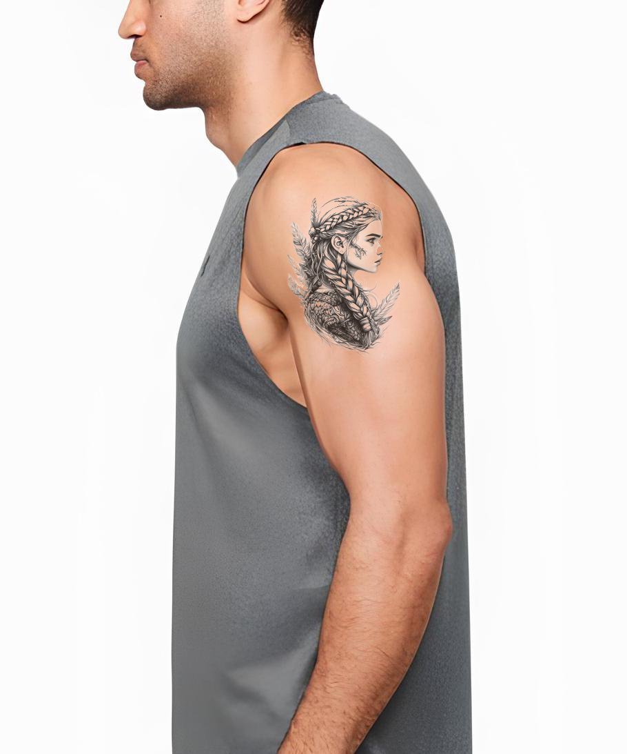 Immergiti nella mistica nordica con questo design di tatuaggio di una donna vichinga in bianco e nero. Lei incarna la forza e il coraggio delle leggende guerriere, le sue intricate trecce e la sua armatura dettagliata simboleggiano il suo spirito indomabile. Una scelta di inchiostro perfetta per coloro che sono coraggiosi di cuore e ispirati dal valore vichingo.