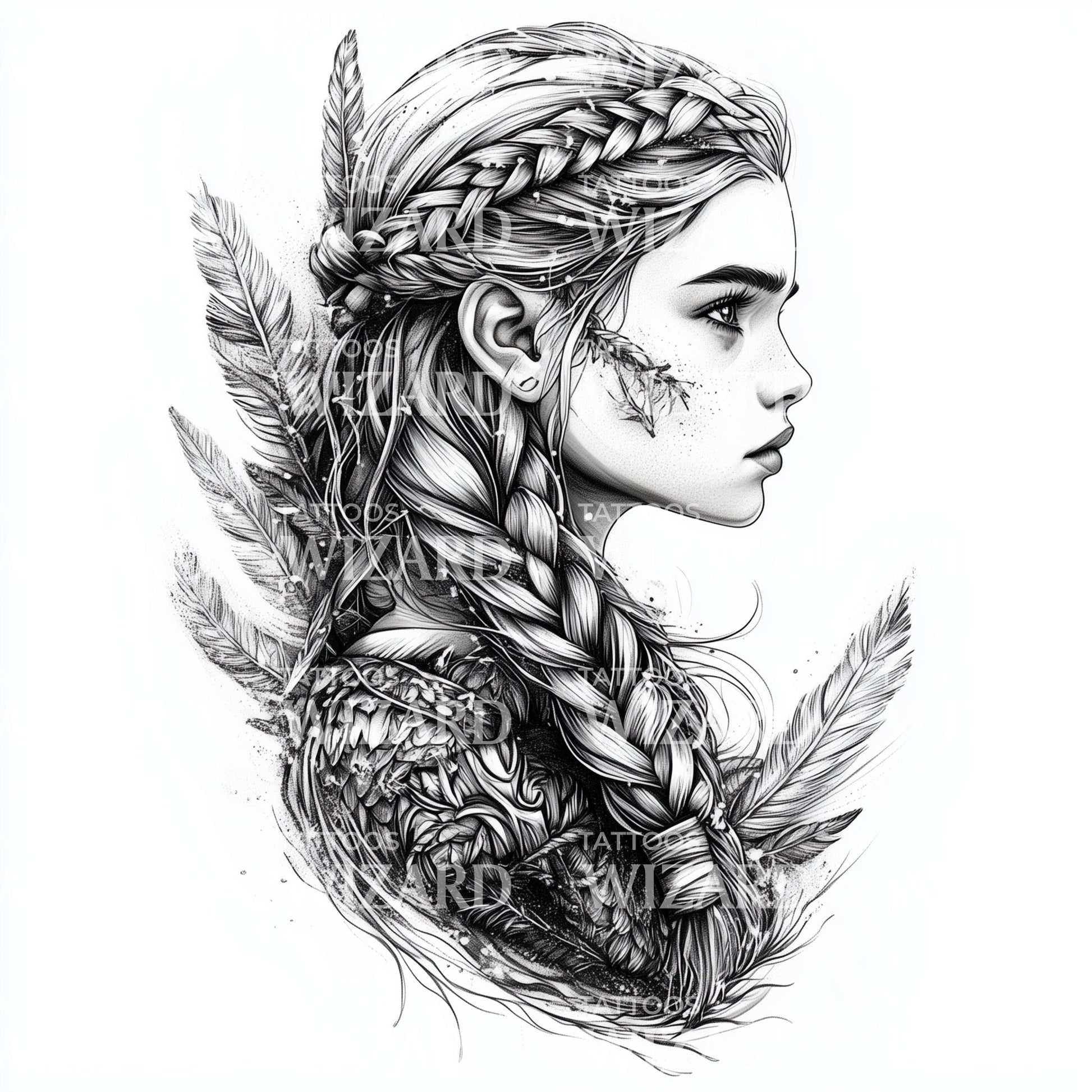 Design del Tatuaggio di una Giovane Donna Vichinga con Capelli Intrecciati