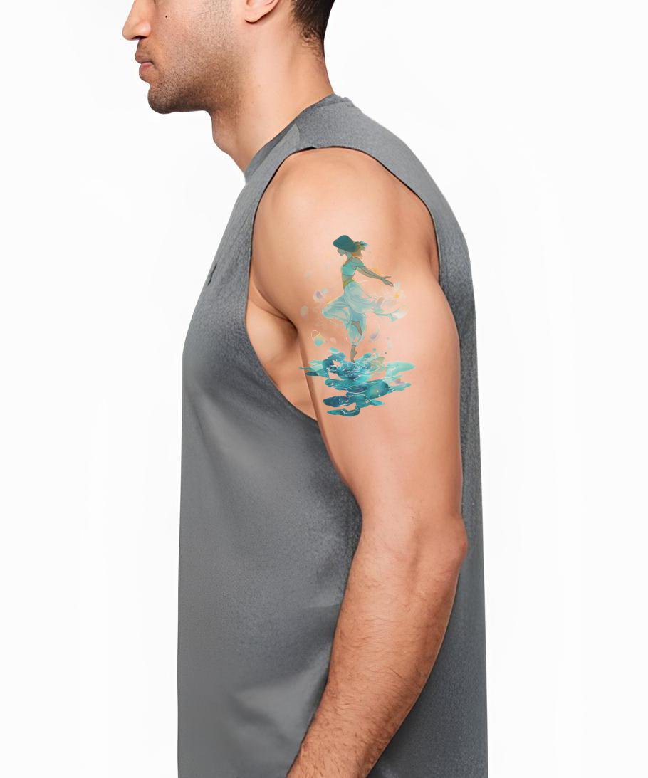 Immergiti nella grazia del movimento con questo disegno di tatuaggio ad acquerello. Ispirato a una danzatrice e a una ninfa dell'acqua, incarna il movimento fluido con schizzi di colore che scorrono senza sforzo. Questo disegno è una splendida ode all'eleganza della danza e alla tranquillità dell'acqua.