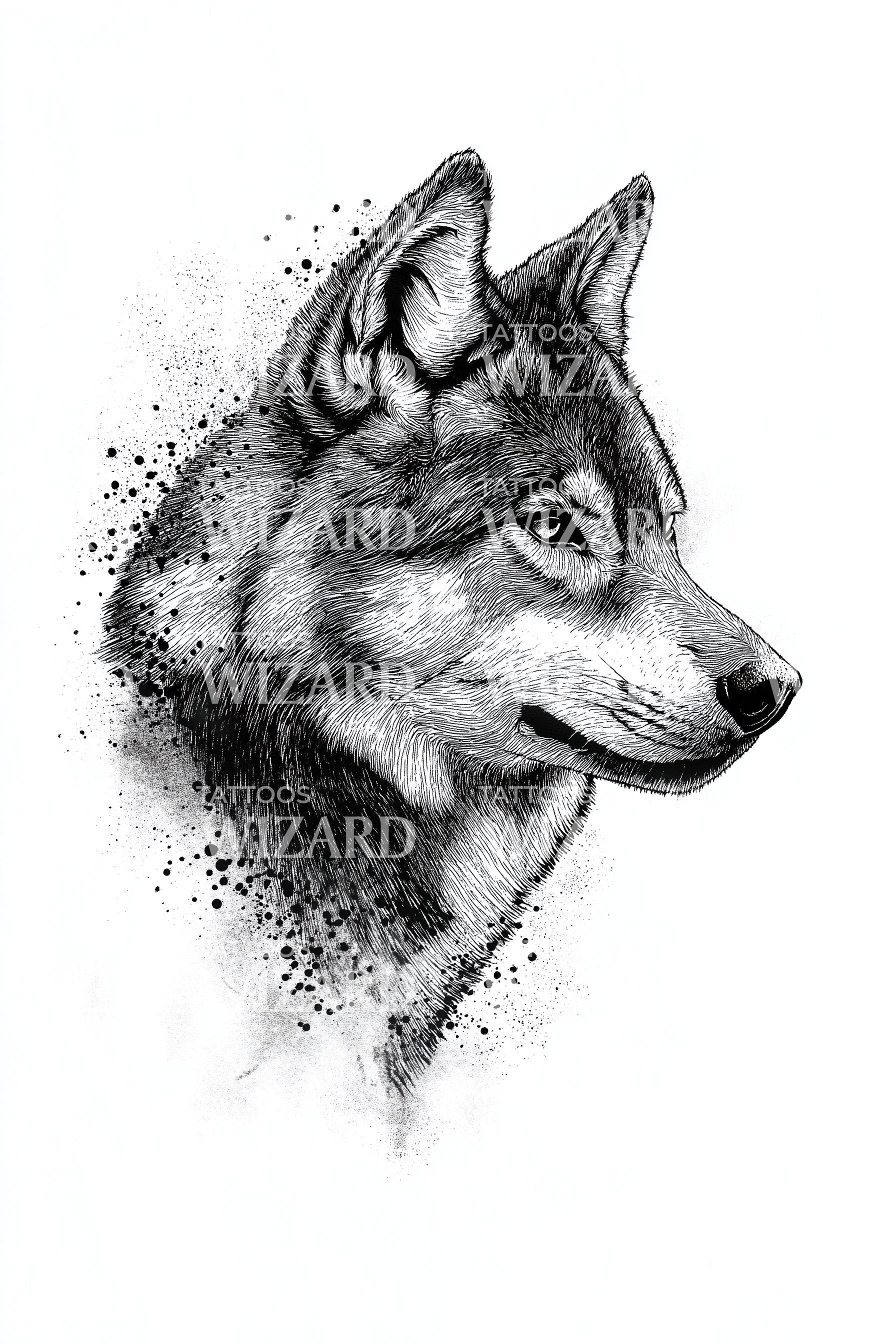 Wolf in profile, a predator rendered in quiet resolve, where shading turns instinct into oath. Drawn to the ones who lead without noise, who trust their hunger but choose their moment. Splatter speaks of battles survived, not regretted. Silence is the sharpest portrait.