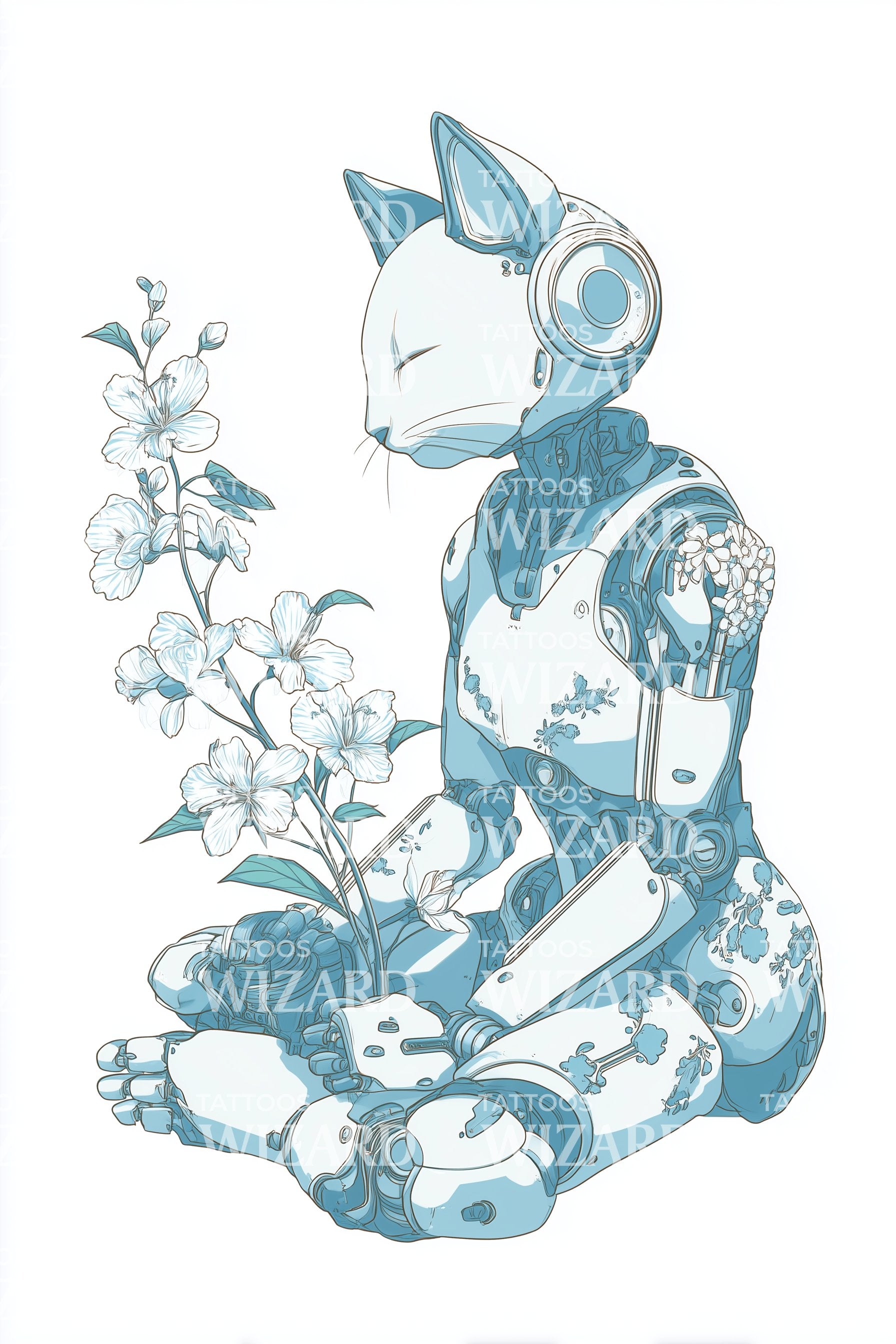 Libera il tuo amore per l'insolito con il nostro design di tatuaggio ad acquerello. Unisce magnificamente la serenità degli elementi floreali delicati con un unico gatto droide, rappresentando un'armonia calma tra natura e tecnologia. Ideale per chi ha il coraggio di distinguersi.