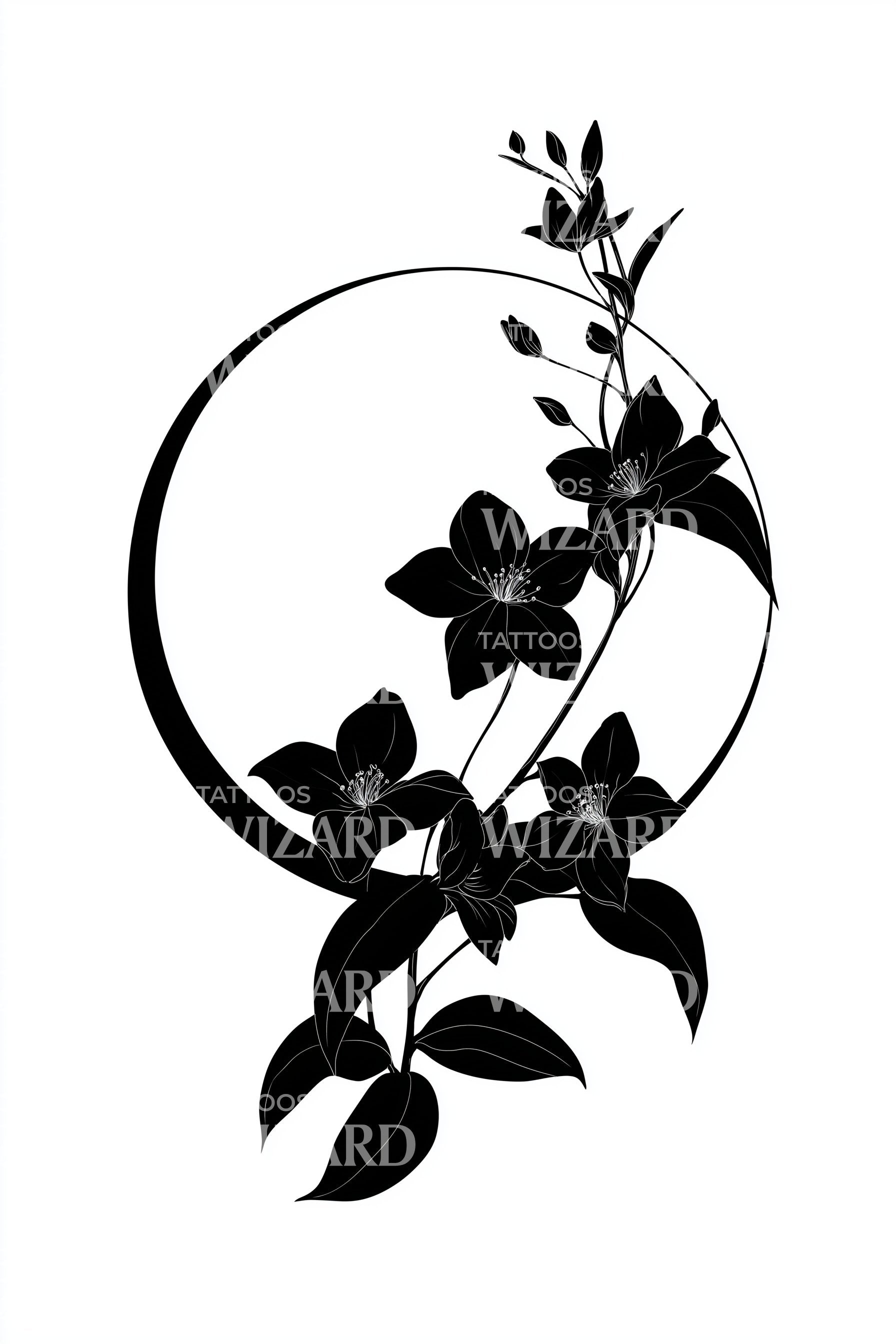 Immergiti nella tranquillità con questo disegno di tatuaggio blackwork ispirato allo zen. Cerchi di viti intrecciate si fondono armoniosamente con squisiti motivi floreali, creando un'opera d'arte botanica sofisticata. Audace ma delicato, questo design è l'epitome dell'eleganza naturale e della serenità, rendendolo una scelta perfetta per un tatuaggio.