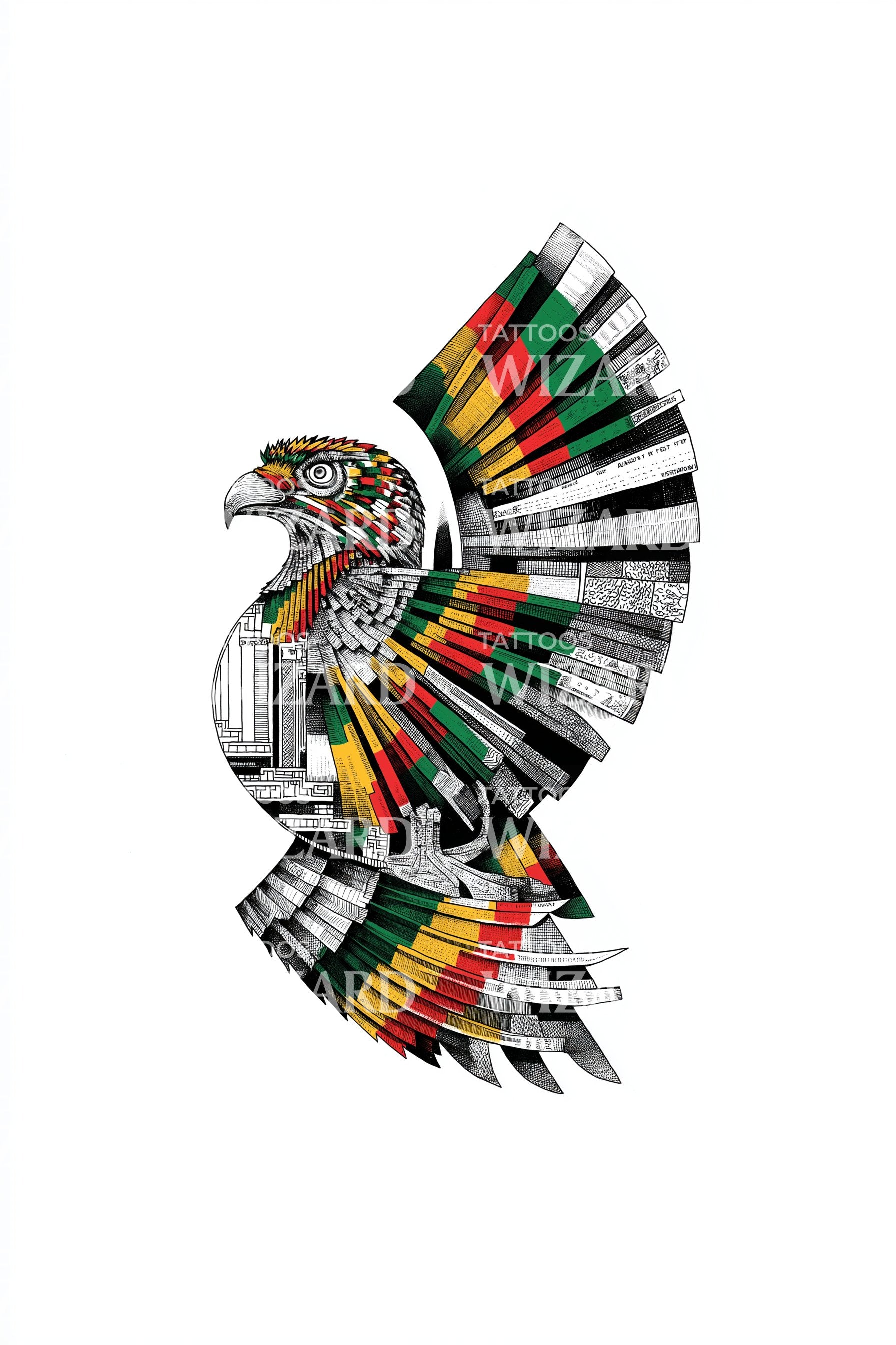 Celebra l'eredità con un tatuaggio ad acquerello che presenta l'iconico emblema dell'Uccello dello Zimbabwe. Morbide sfumature e colori vibranti si diffondono attraverso piume delicate, fondendo tradizione e arte moderna. Evoca orgoglio, libertà e storia mentre gradienti fluidi si propagano sulla pelle, un tributo luminoso allo spirito dello Zimbabwe e alla tua storia personale, al tuo viaggio.