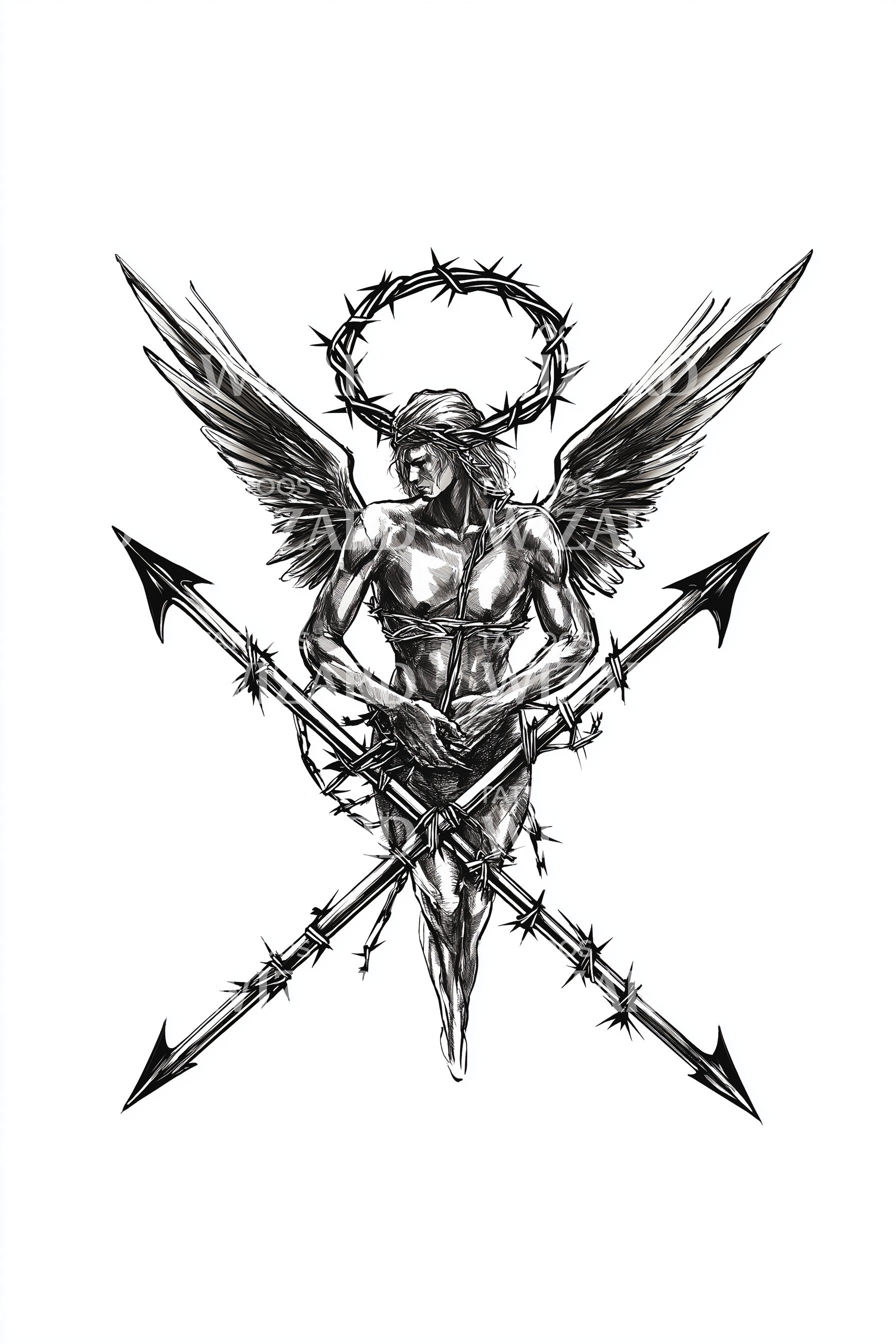 Ink-forged guardian rendered in stark black lines, wings fanned, head bowed beneath a thorned halo. Crossed spears and barbed wire frame the body, symbols of trial transforming into armor. This divine sentinel speaks of sacrifice, vigilance, and protection, letting its wearer feel shielded, steadfast, and bravely guided.