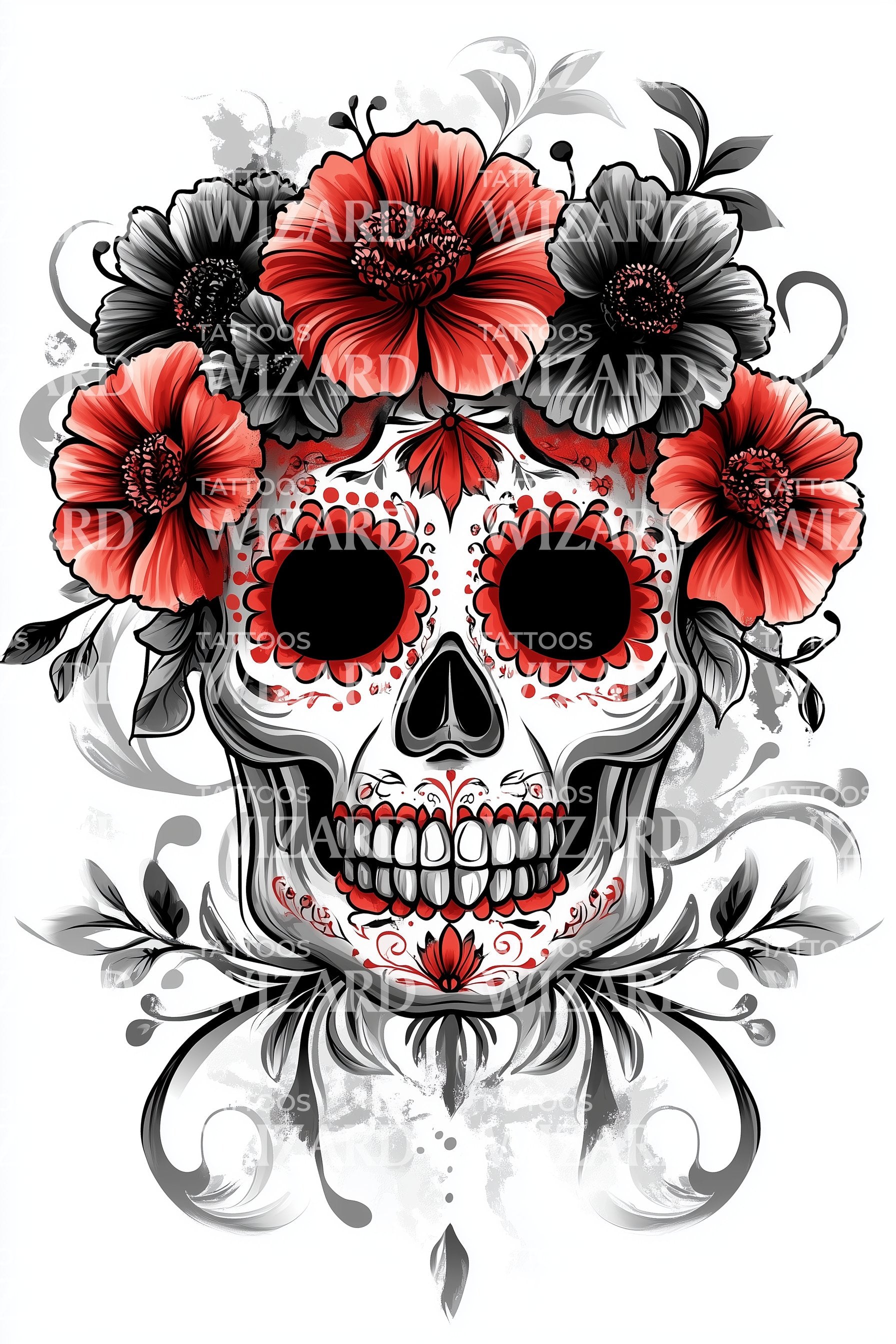 この華麗に細部まで装飾されたタトゥーデザインで、あなたの内なる反逆者を解き放ちましょう。死者の日を祝福し、鮮やかな深紅のカラベラが咲き誇る花々に囲まれています。このイラスト風の頭蓋骨は生命の鮮やかな精神を捉え、大胆で永遠に意味深いステートメントピースとなっています。