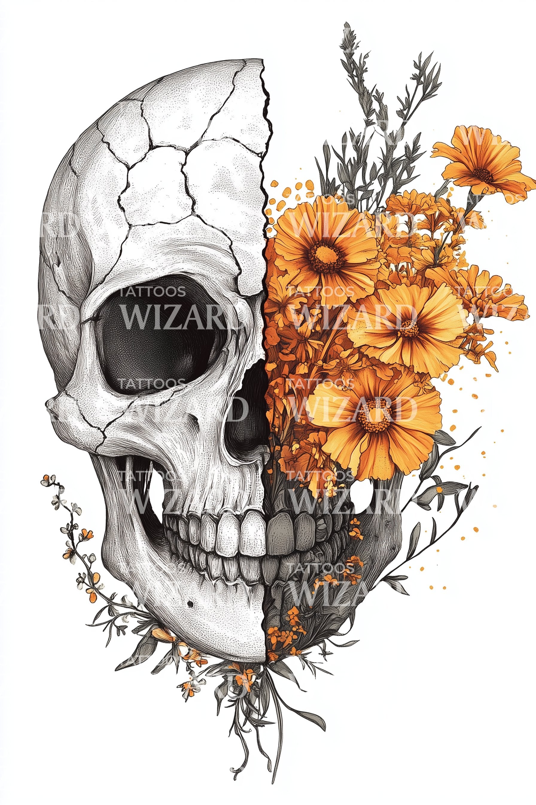 ひび割れた頭蓋骨のマリーゴールドタトゥーデザイン