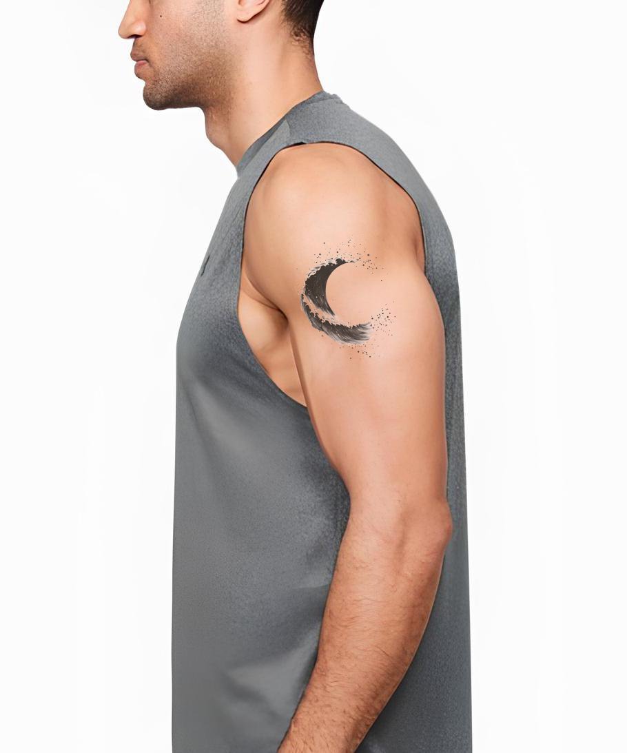 Blackwork crescent wave arcs in a bold brushstroke, frothing into ink splashes and drifting specks, an abstract sea. Motion becomes mantra, evoking moonlit tides, renewal, and pull between calm and surge. Worn, it lends seaworthy courage, fluid grace, and a reminder to rise, return, and flow with purpose.