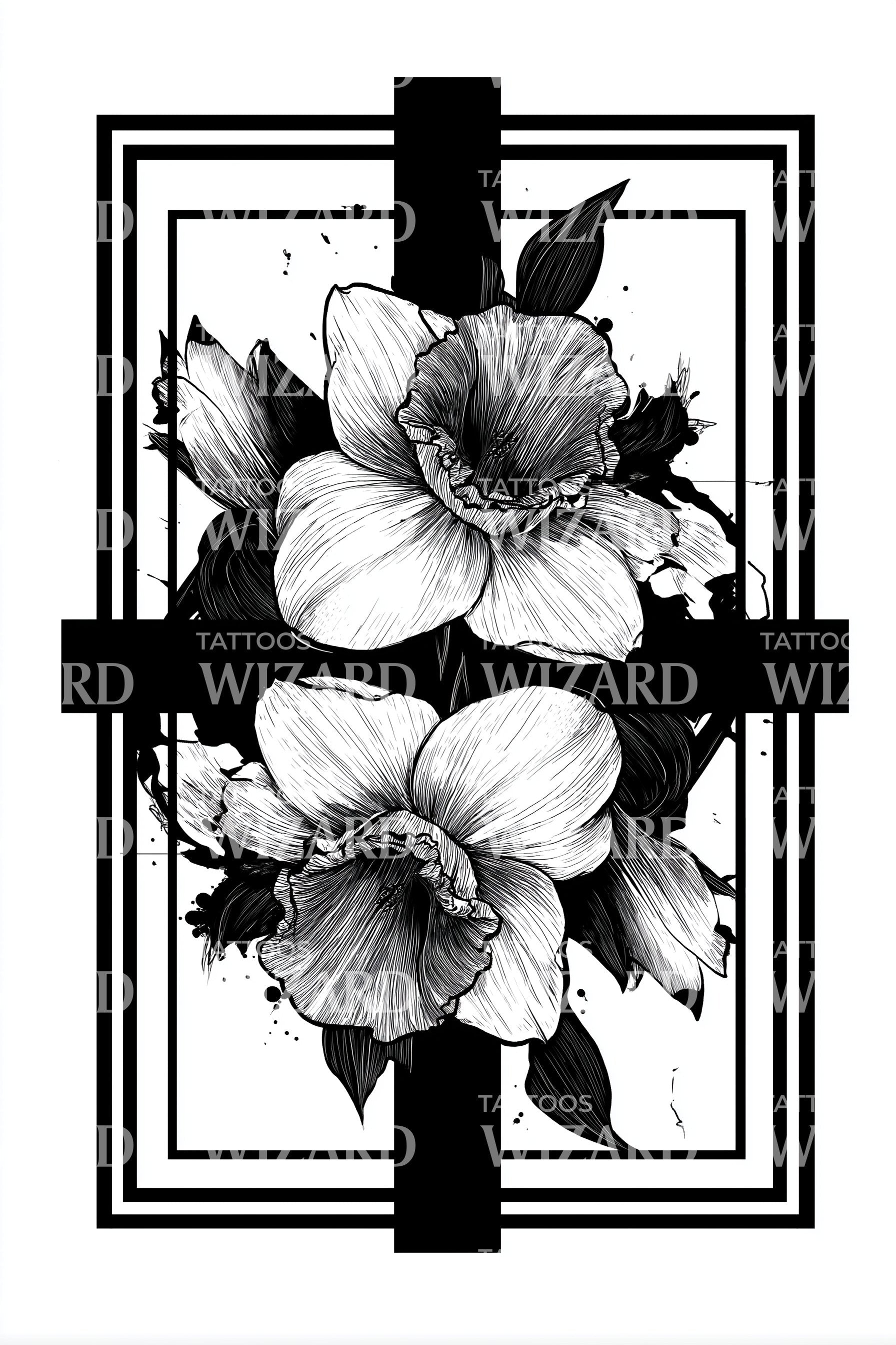 この印象的なブラックワークのタトゥーデザインは、十字架と絡み合う咲き誇る花を独特のフレームに収めています。モノクロの配色がコントラストを際立たせ、細部を強調しながら、精神性と自然を見事に融合させています。大胆で美しいあなたにふさわしい魅力的なイラストレーションです。