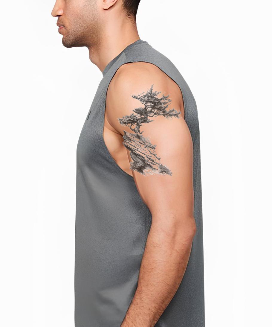 この黒と灰色のタトゥーデザインで静けさに浸ってください。詳細に描かれた糸杉の木と繊細な花や葉に囲まれた自然の美しさを完璧に捉えています。力強い幹と穏やかな背景を強調したこの平和なデザインは、雄大な自然の静けさを見事に称えています。