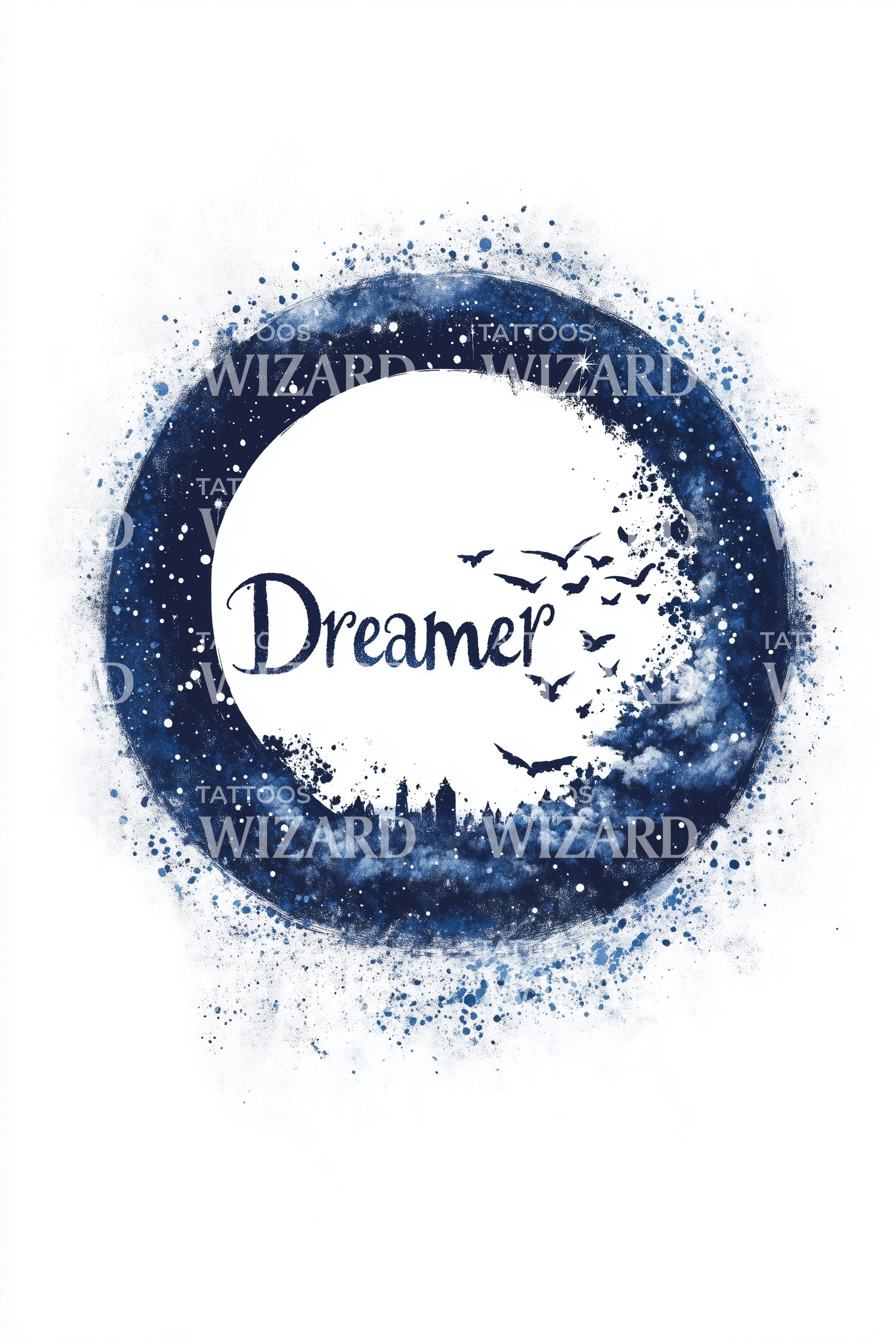 Midnight, brush-kissed watercolor circle forms a halo, flecked with stars and a city silhouette; birds dissolve into Dreamer. Minimalist ring guards possibility; flock lifts intention beyond limits. Wears like quiet courage. Ideal on inner forearm for line, sternum for center, upper back for spread, or calf for stride.