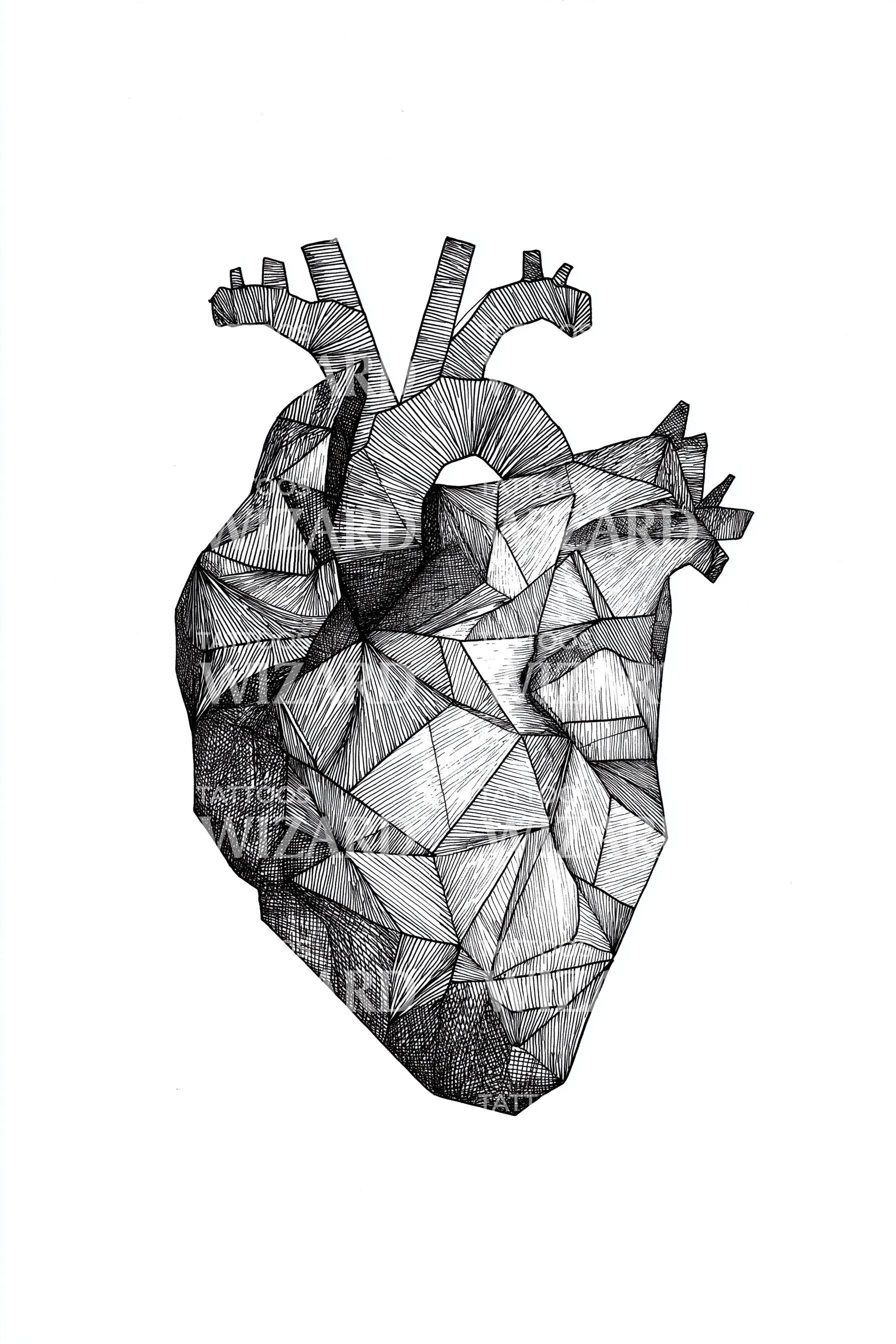 Fineline, anatomically precise heart built from faceted planes and crosshatched veins, merging medical realism with organic geometry. Each shard suggests vulnerability and resilience, the chambers mapping lived experience. Worn on skin, the design feels grounded, brave, and intimate, a quiet pulse of truth and enduring connection.