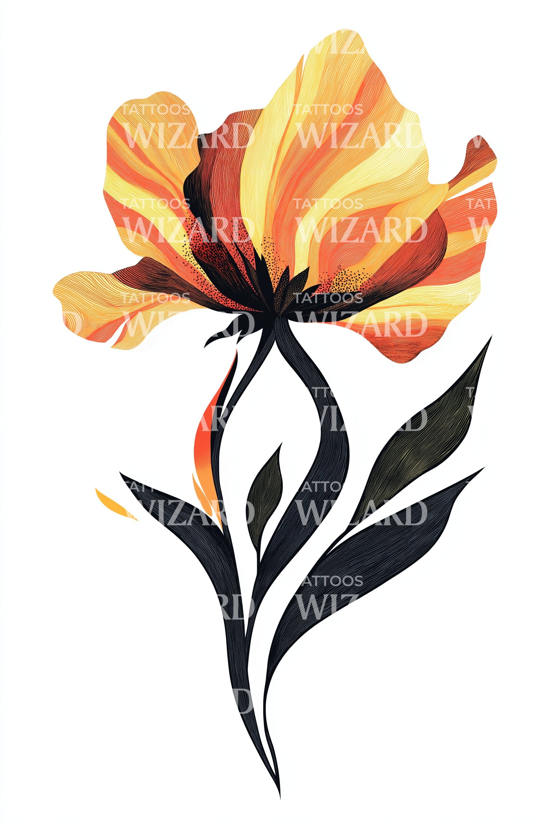 このファインラインタトゥーデザインで肌を飾りましょう。咲き誇るアイリスの花の優雅さを表現しています。アンバーの色合いが大地のトーンを加え、洗練されたミニマリズムと完璧に調和しています。美しさとシンプルさが融合した、この作品は自然の花の洗練さを芸術的に捉えたものです。