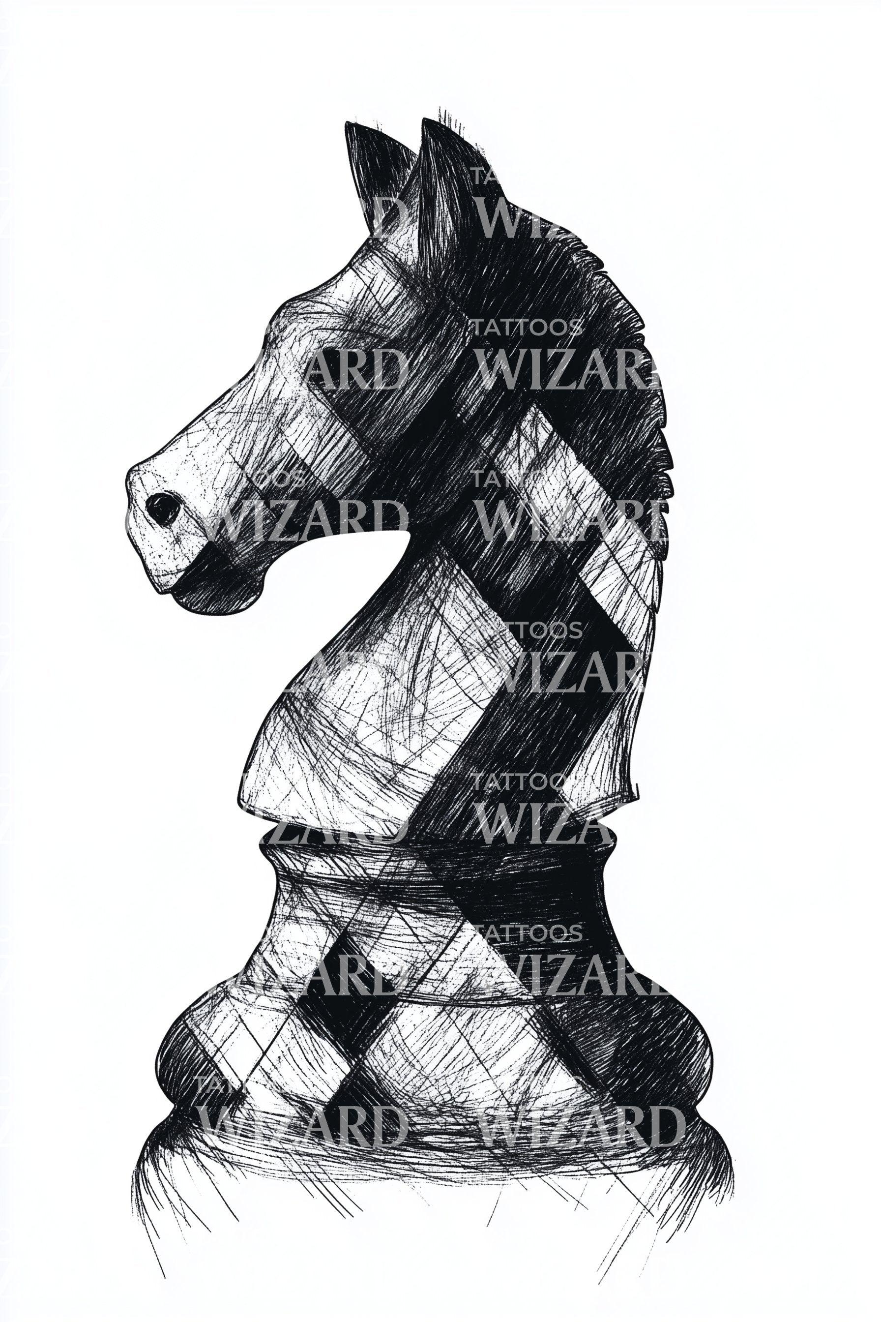 Ink-drawn knight head rises in bold crosshatching, classic black on white with subtle checkered shadows of chess. A tribute to strategy, lateral thinking, and steadfast courage, where every move matters. Wearing it feels like calm command in motion, poised strength at the ready, a personal emblem of calculated heart.