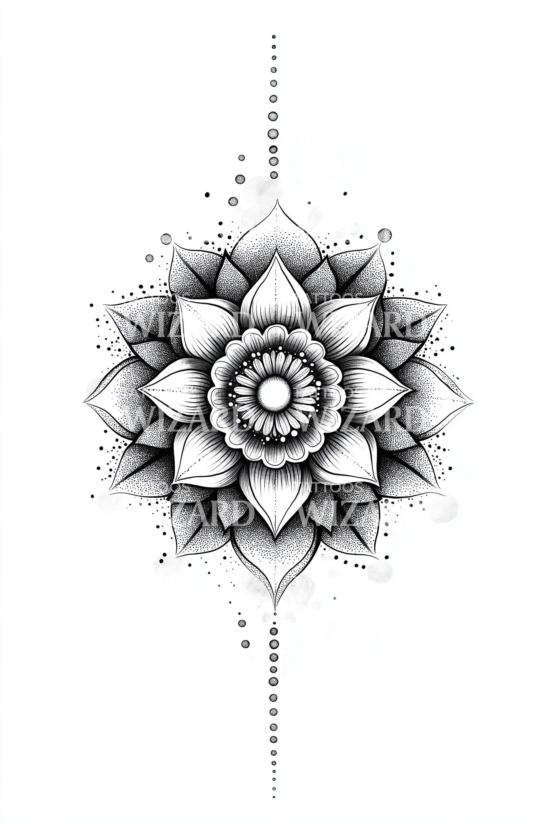 神聖なマンダラタトゥーデザインで精神的な優雅さを発見してください。精巧なドットワークで美しく作られ、多用途な幾何学的枠組みの中に魅惑的な花のモチーフを描いています。神聖な対称性の証であるこのタトゥーデザインは、あなたの身体を魅惑的な芸術のキャンバスへと変えるでしょう。