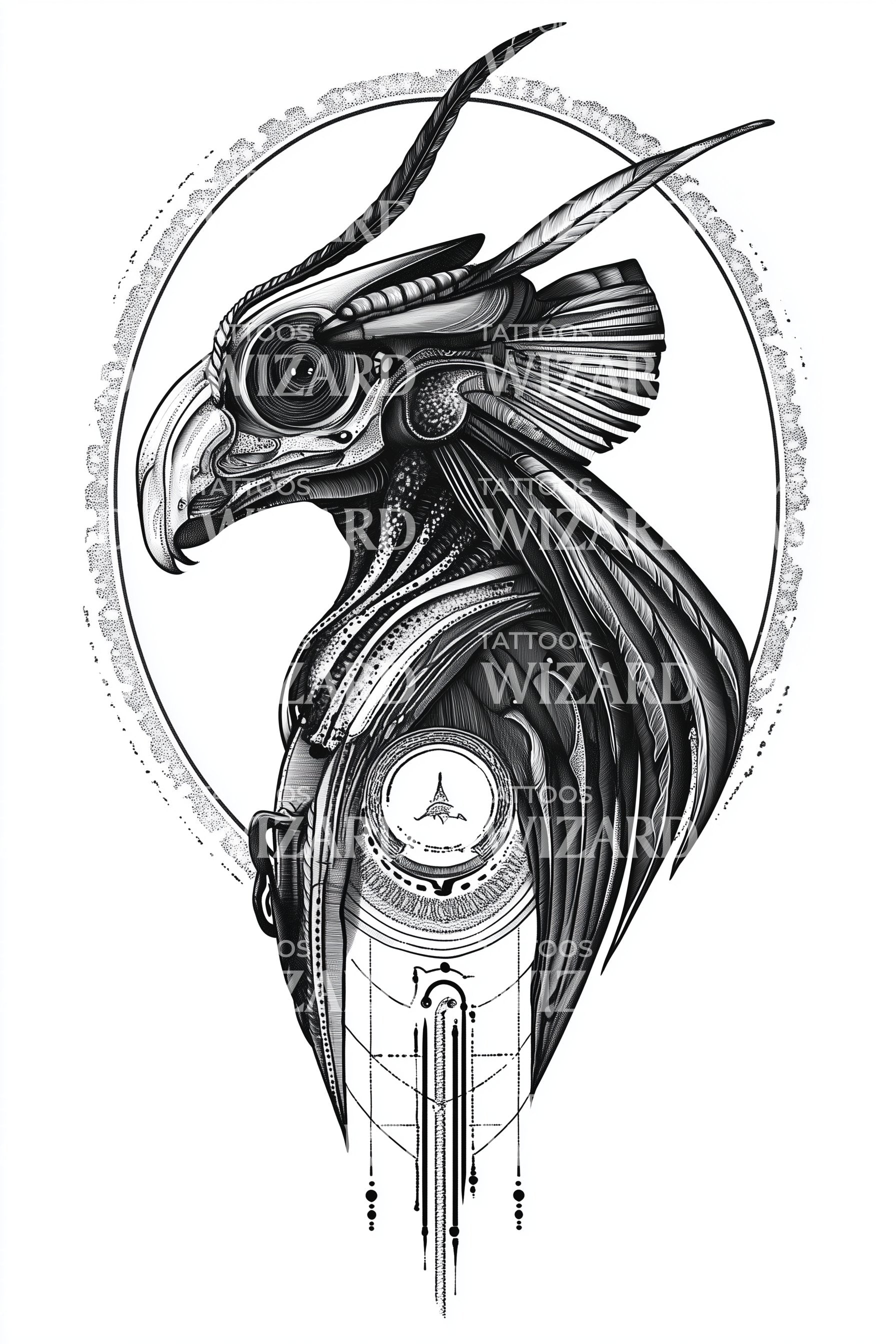 Geometric steampunk elegance meets raven mystique in this profile portrait. Feathered plates, exposed gears, and precise dotwork form a sleek clockwork guardian. Symbolizing intelligence, transformation, and engineered resilience, it speaks of journeys through shadow to insight. Wearing it feels poised, inventive, and fiercely self-directed, heart ticking forward.