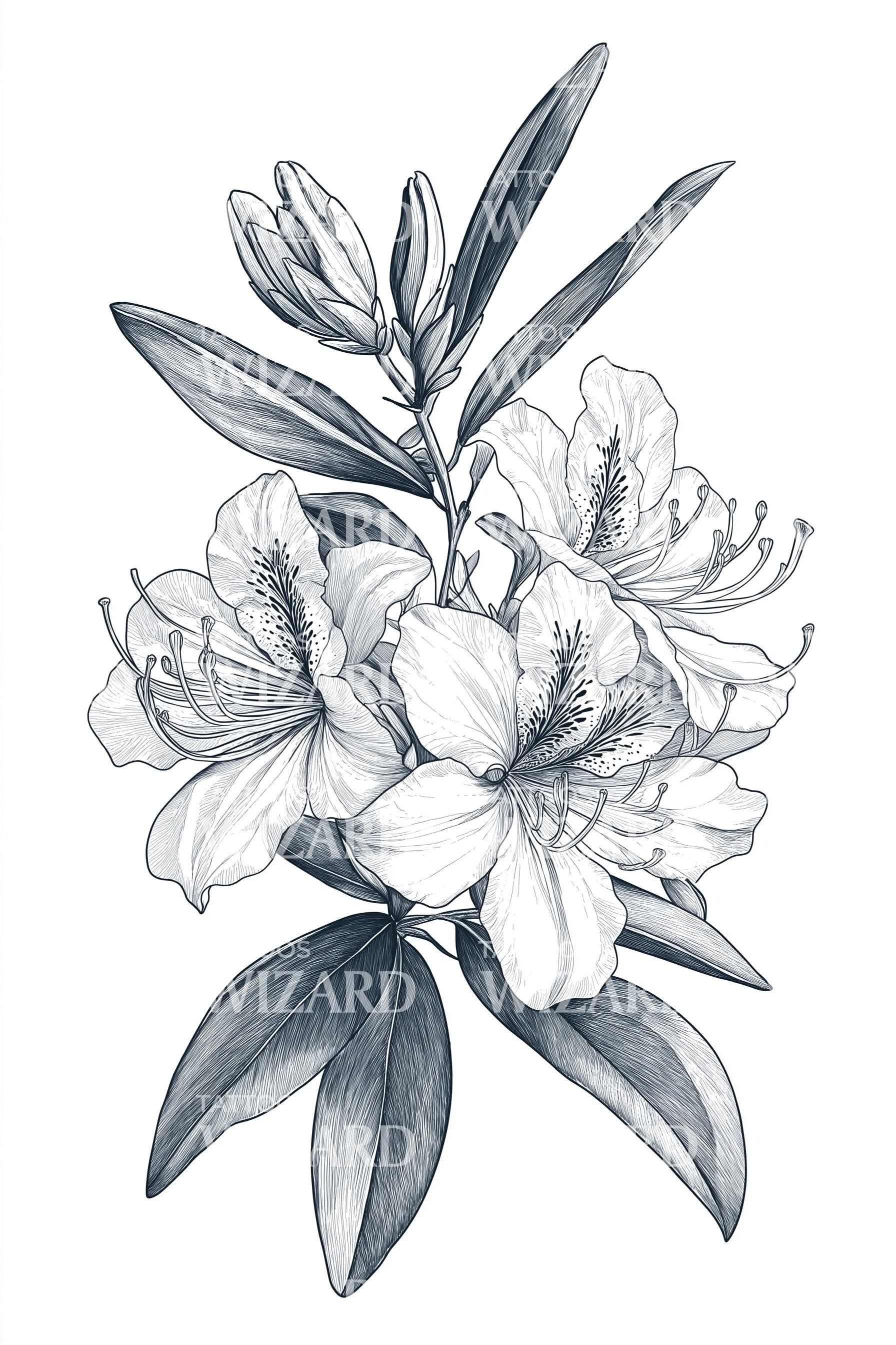 Fine-line elegance gathers a peony-like bloom with slender olive leaves, forming a luminous bouquet of flowers and sweeping foliage. Peony whispers devotion and renewal; olive offers peace and perseverance. Worn on skin, this design breathes calm confidence, a gentle reminder to thrive with grace and grounded heart daily.