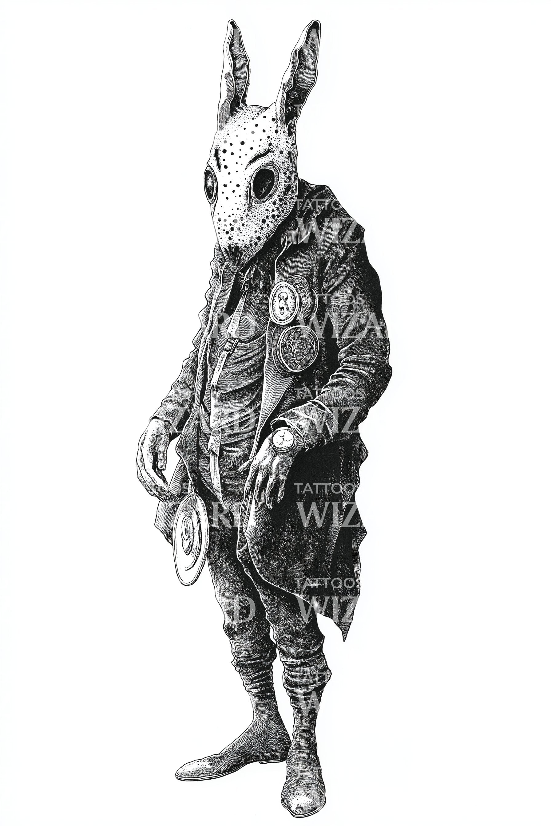 Meticulous illustrative linework presents a Victorian rabbit gentleman in a weathered coat, medals gleaming, pocket watch poised. Stippled shading and crisp crosshatch elevate the mask-like muzzle to myth. Symbols of time and honor marry instinct and etiquette, inviting curiosity, resilience, and secret nobility. Wearer feels timeless, composed, intriguingly untamed.