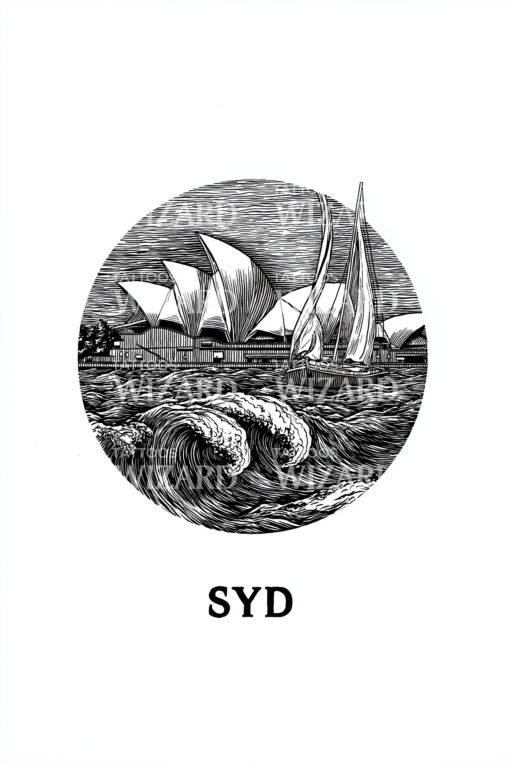 Hand-etched emblem in fine, illustrative lines: a circular harbour scene where curling sea swells meet sleek sails and the shell-like forms of Sydney’s Opera House, with SYD grounded below. Symbol of voyage and home, it honors resilience, salt air, and compass-true belonging, gifting steady courage and tidal calm.