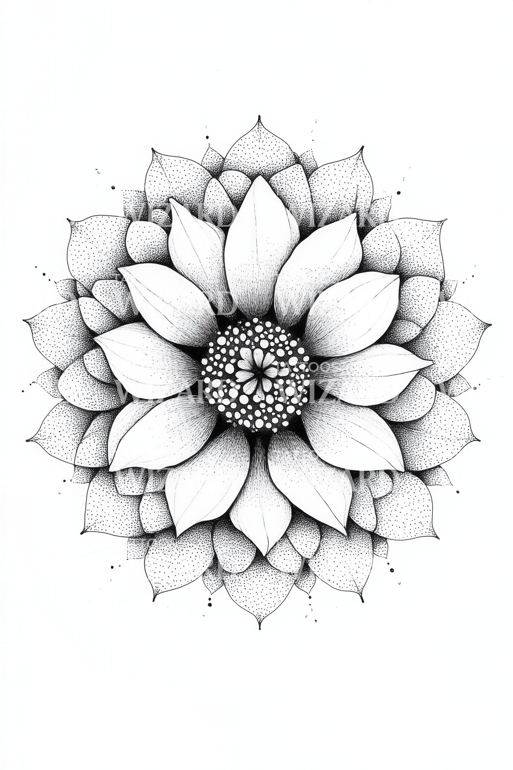 このひまわりのマンダラタトゥーは、咲き誇る美しさと繊細な花びらを、緻密な幾何学的ドットワークと融合させています。その魅力的なデザインは、自然の対称性と生命の絶え間ない循環を体現しています。この作品は調和の感覚を呼び起こし、静けさと躍動感の融合を求めるあなたに最適です。