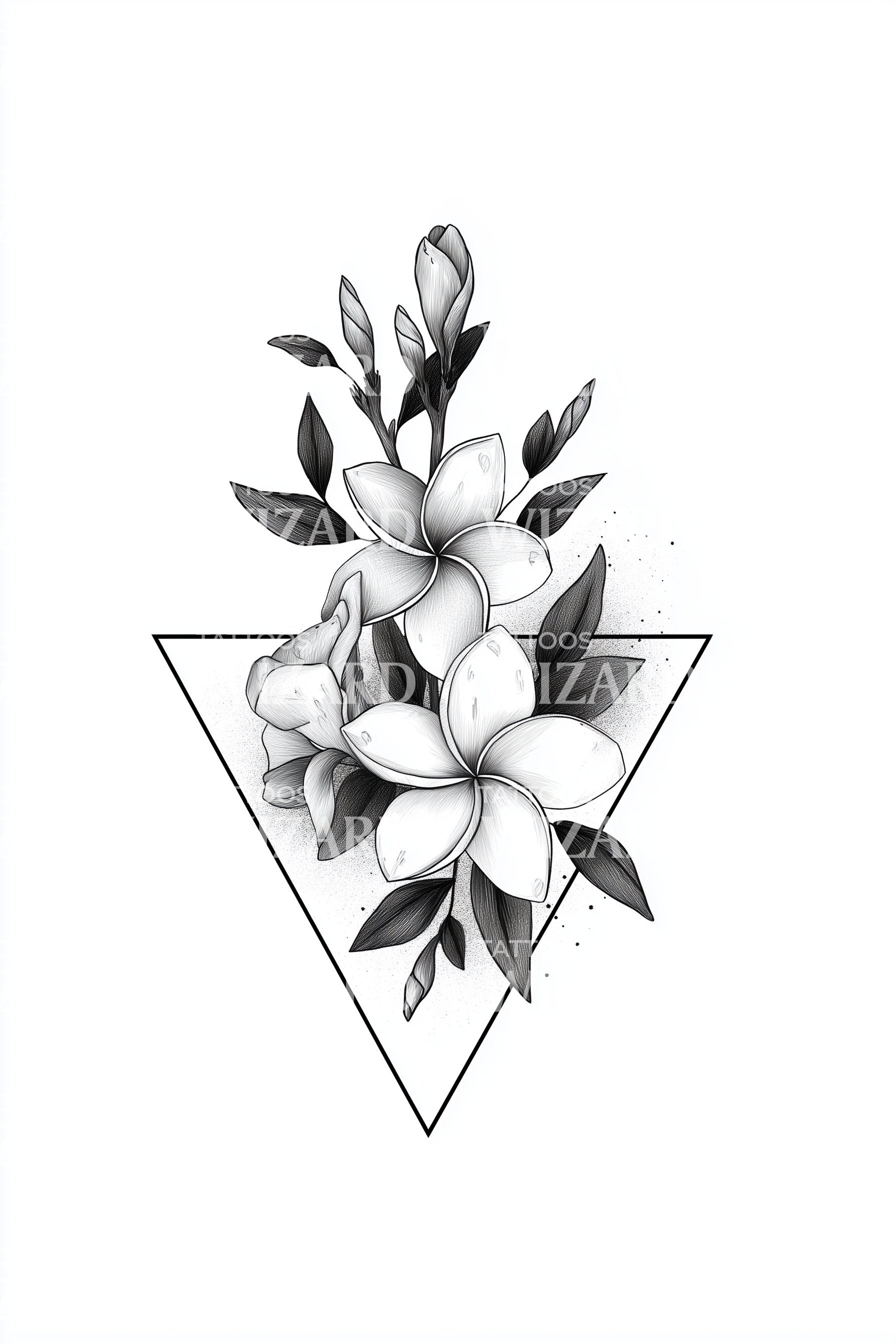 繊細なジャスミンの花が魅力的な三角形の中に巧みに配置された幾何学的なタトゥーデザインを発見してください。この下向きの花束は、自然の美しさと幾何学の精密な魅力が優雅に融合しています。独自性とスタイルを求めるあなたに最適なデザインです。