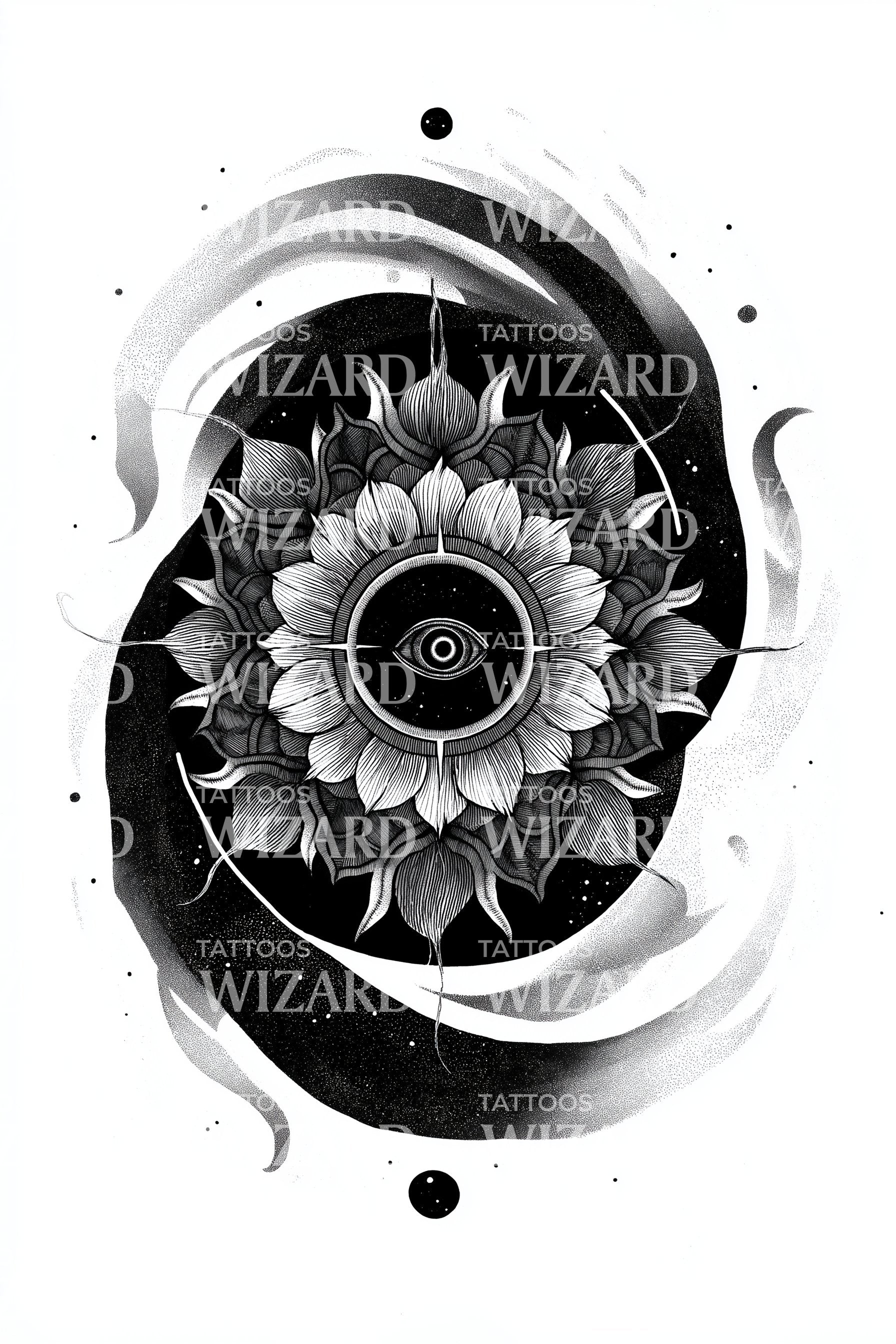 このブラックワークタトゥーデザインの魅惑的な魅力を体験してください。精巧に描かれた魅力的なマンダラパターンが、対比の渦巻く渦へとあなたを引き込みます。大胆な渦巻きと鮮やかな黒のトーンが、あなたのボディアートに独特のエッジを与えます。闇の磁力的な魅力の真の証です。