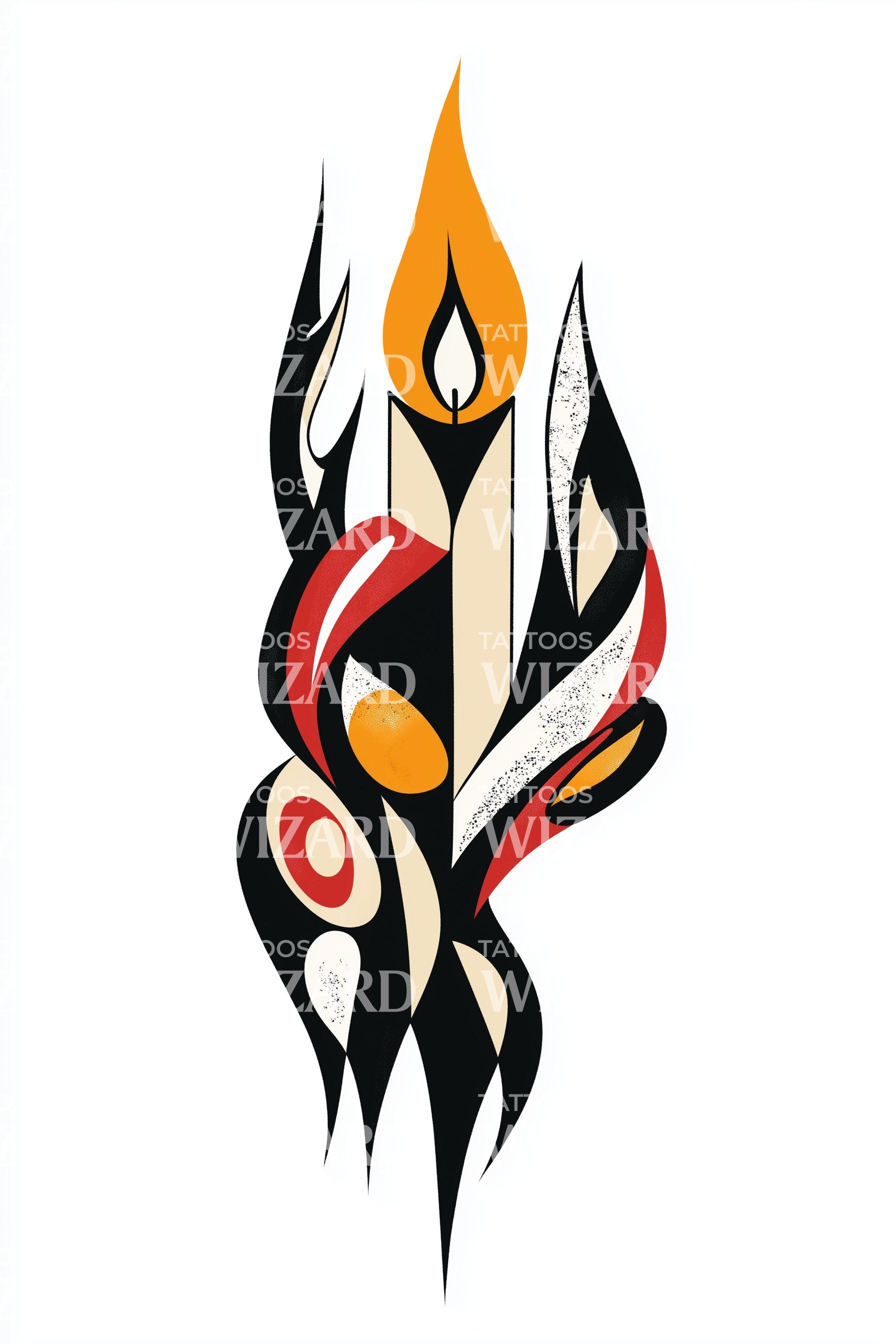 이 역동적인 현대 타투 디자인으로 당신의 스타일에 불을 지피세요. 생생한 수채화 색조가 충돌하며 폭발적인 불꽃 테마를 만들어내는 추상 미술의 에너지를 활용하세요. 예술적 감각과 색채가 인상적으로 융합된 이 작품은 전통적인 타투 미학에 독특한 변주를 선사합니다.
