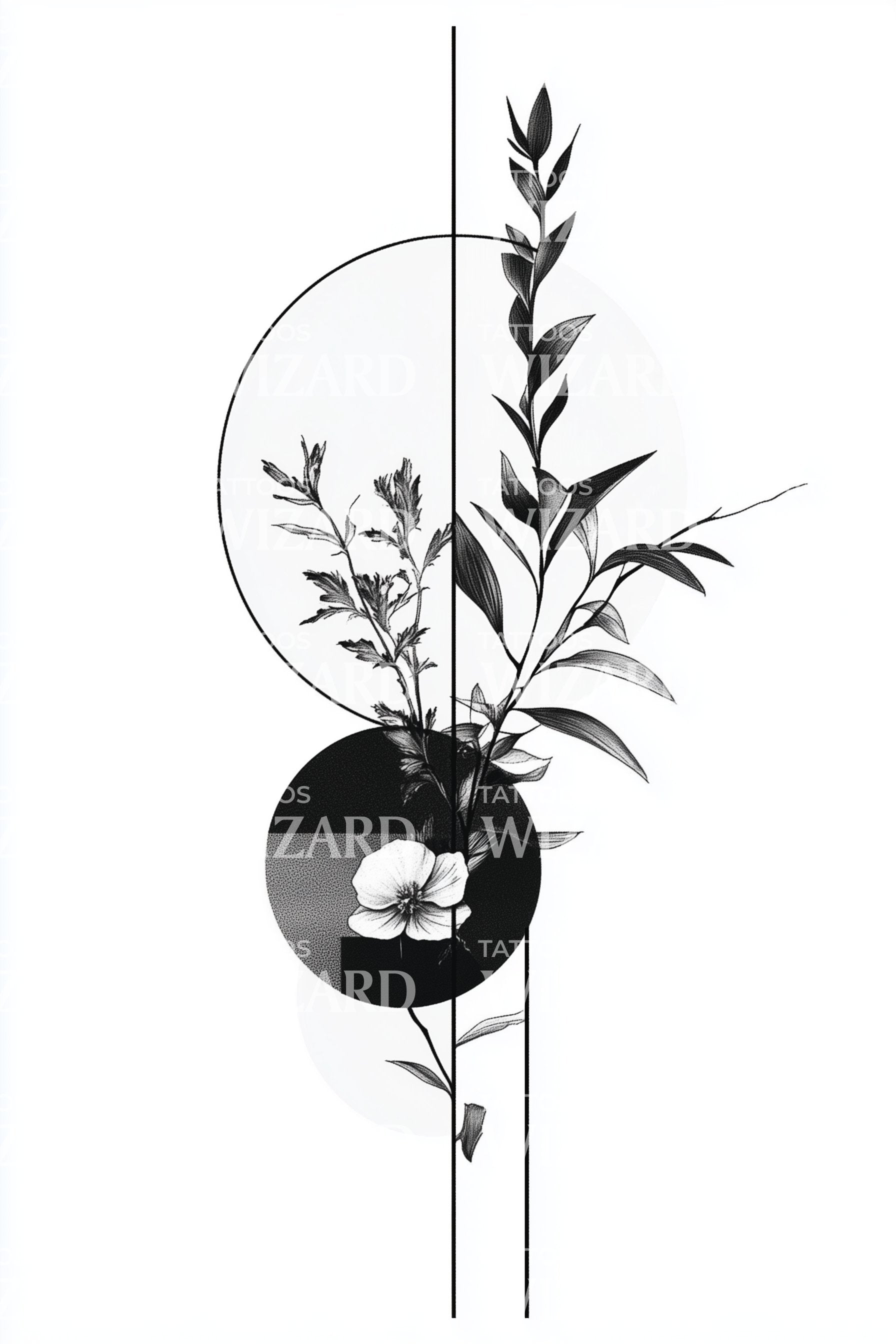 이 미니멀리스트 파인라인 타투 디자인은 자연과 기하학의 요소를 아름답게 통합합니다. 중심 모티프는 섬세한 식물 꽃으로, 완벽하게 정의된 축 안에 스케치되어 단순한 원형 선으로 감싸져 있습니다. 미니멀리스트 바디 아트를 사랑하는 이들을 위한 은은하면서도 깊이 있는 구성입니다.