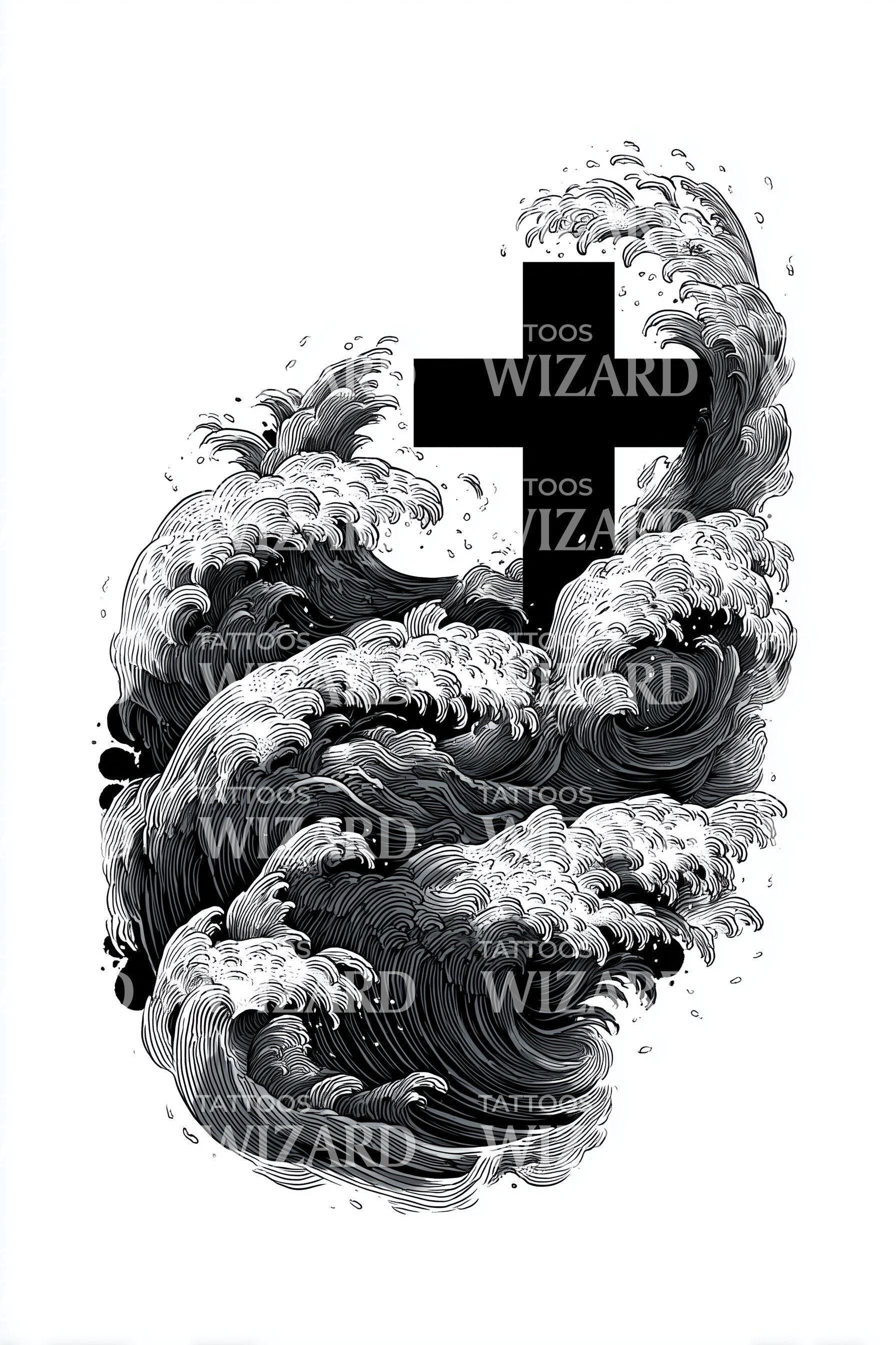 거친 신앙의 아름다움에 빠져보세요. 이 흑백 타투 디자인은 강인함과 회복력을 구현하기 위해 제작되었습니다. 격동하는 파도와 십자가가 결합되어 인생의 시련과 신앙의 불굴의 정신을 상징합니다. 이 독특하고 어두운 예술 작품으로 당신만의 흔들리지 않는 신념을 선언하세요.