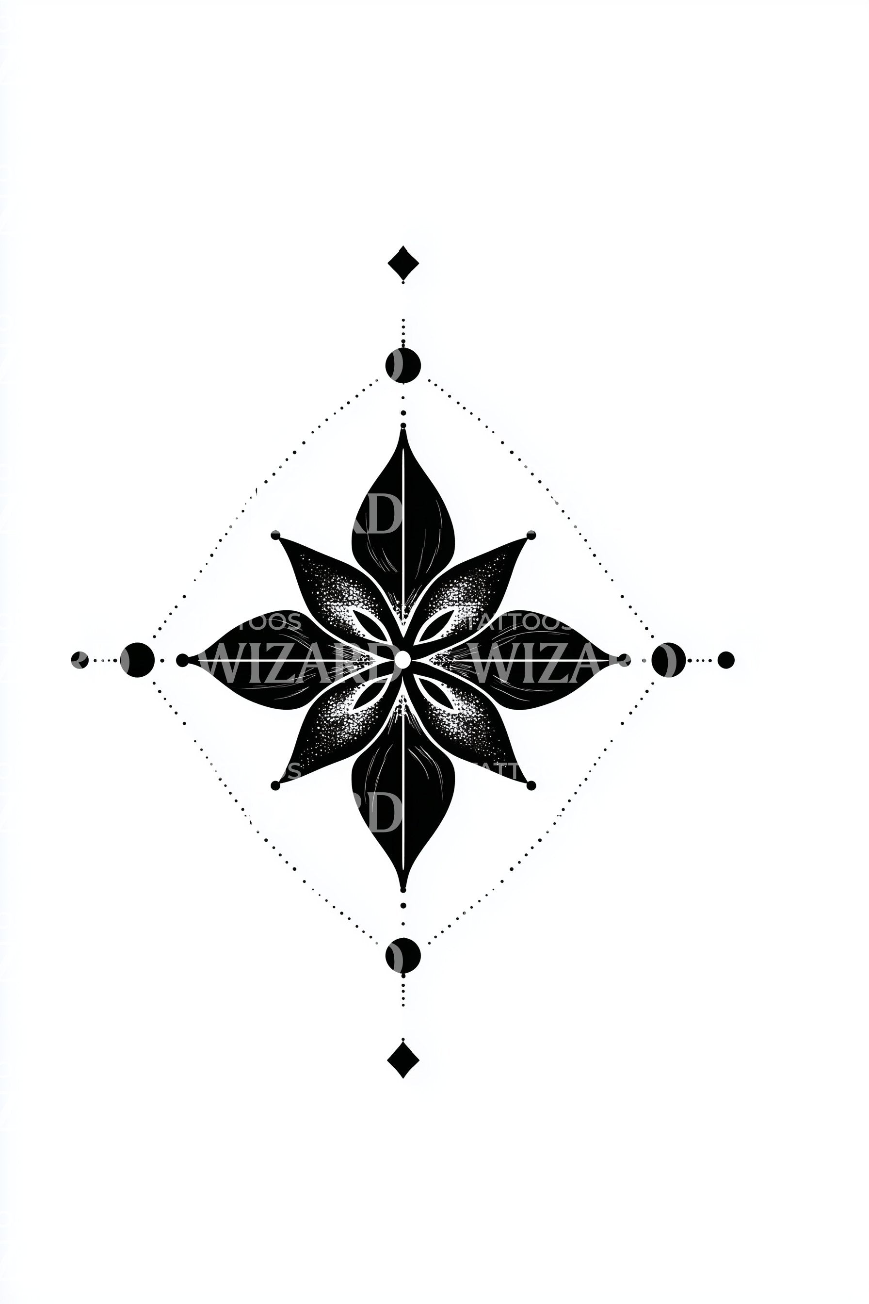 Geometric compass rose blooms in bold blackwork, six sculpted petals radiating from a steady core, haloed by dotted diamond orbits and precise points. Symbolizing navigation, balance, and purpose, it honors journeys taken and paths ahead. Worn on skin, it feels centering, quietly brave, elegantly ornamental, and beautifully grounded.