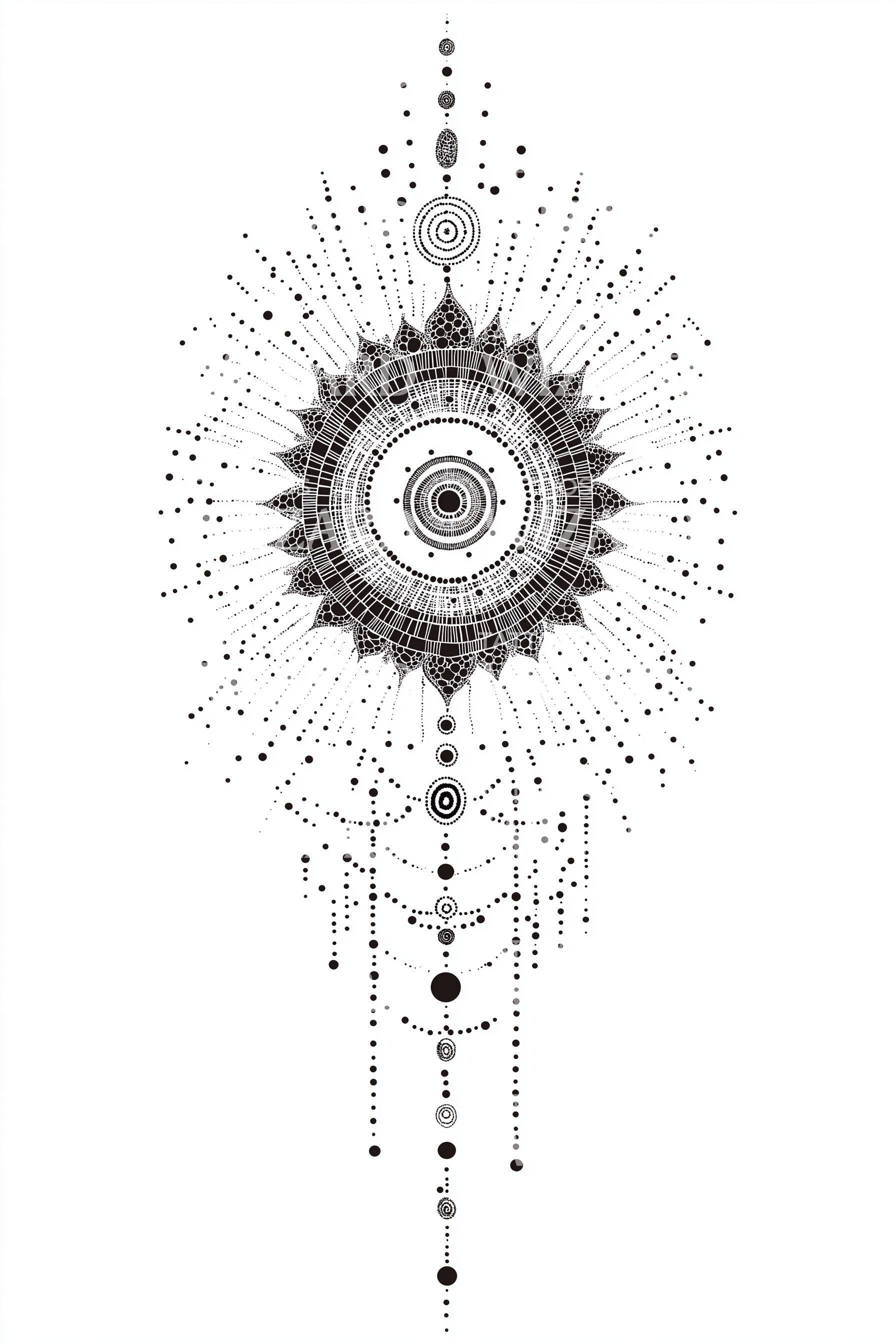 이 빛나는 닷워크 타투 디자인은 우주와 만다라 요소를 아름답게 조화시켜 천체의 걸작을 만듭니다. 에너지로 가득 찬 정교한 디테일이 인상적이고 독특한 미학을 보장합니다. 확실히 돋보이는 이 타투는 우주의 마법을 놀라운 닷워크 표현으로 담아냅니다.