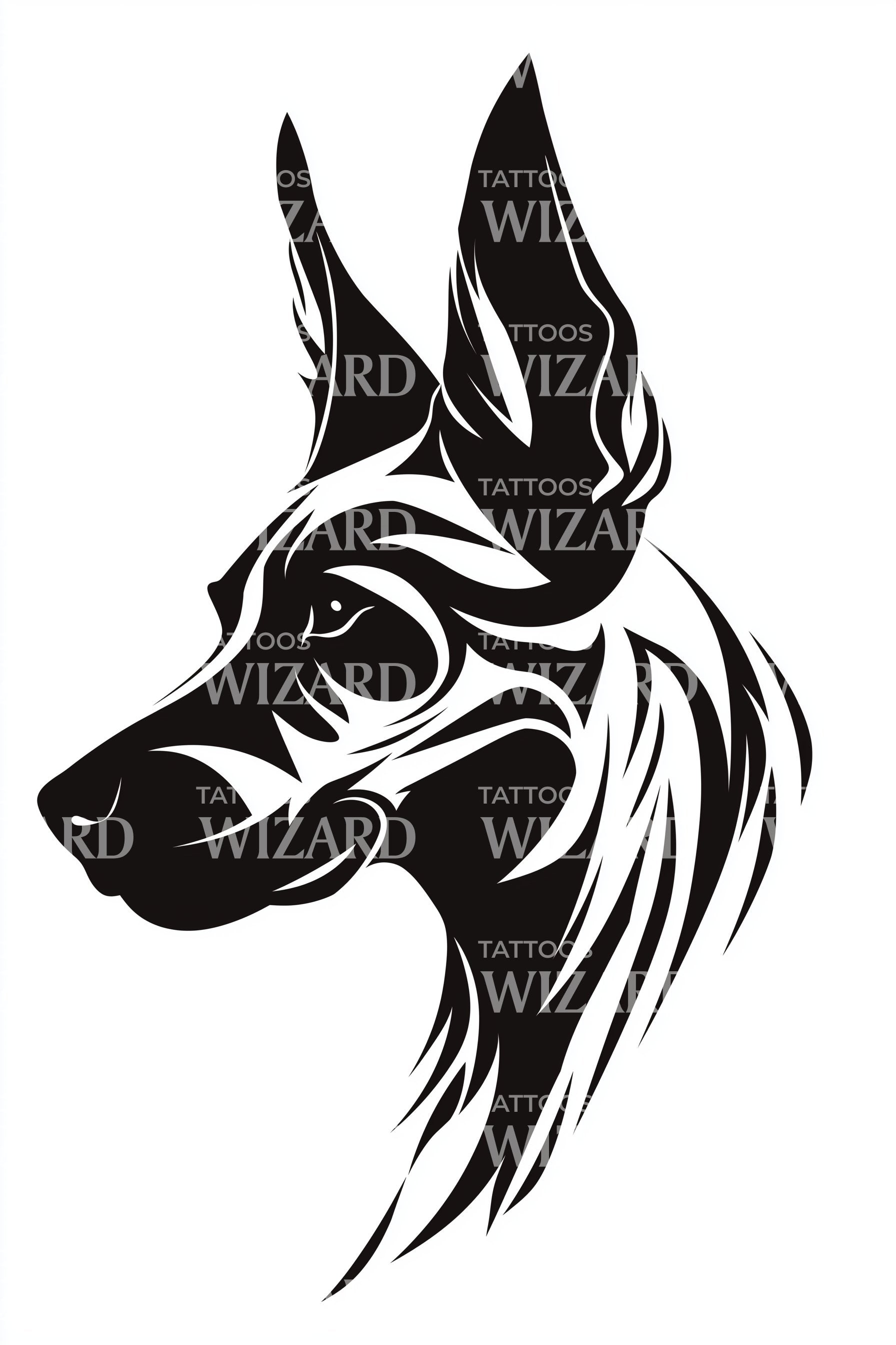 Sculpted in bold tribal sweeps, a Doberman profile rises in high-contrast blacks, ears pricked and lines flowing like steel flame. The guardian’s gaze speaks of loyalty, focus, and fearless protection. Worn on skin, this canine totem steadies the heartbeat, lending strong calm, alert courage, and unwavering presence.