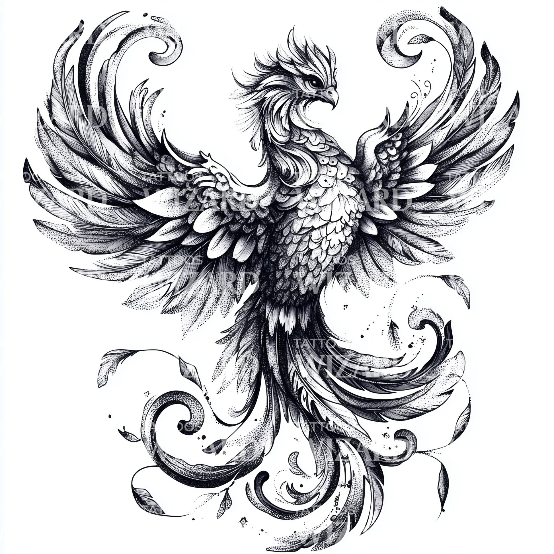 전설적인 불사조의 위엄을 정교한 도트워크 타투 디자인으로 경험해보세요. 놀랍도록 세밀한 날개는 비상의 본질을 포착하며, 꼼꼼한 도트워크가 깊이와 입체감을 더합니다. 이 장엄한 비상의 새를 몸에 새겨 재탄생, 힘, 그리고 당신의 멈출 수 없는 정신을 상징하세요.