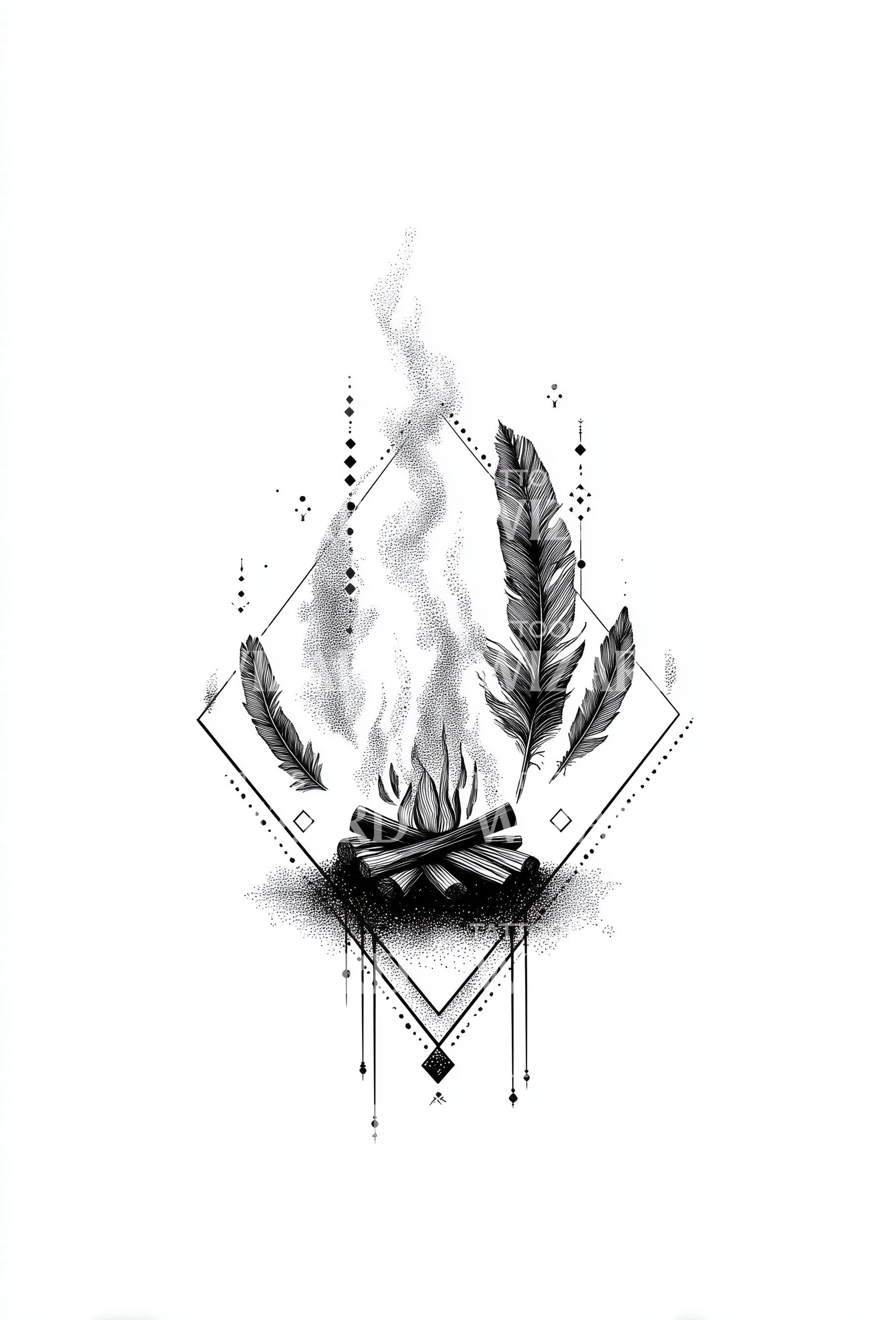 Embers rise within a crisp geometric diamond, dotwork smoke curling above a small flame, circled by fine-feathered totems and delicate ornamental points. Fire symbolizes transformation and will; feathers speak of guidance and lightness. Worn daily, the design feels grounding, protective, and quietly courageous. Invites ritual, focus, and renewal.