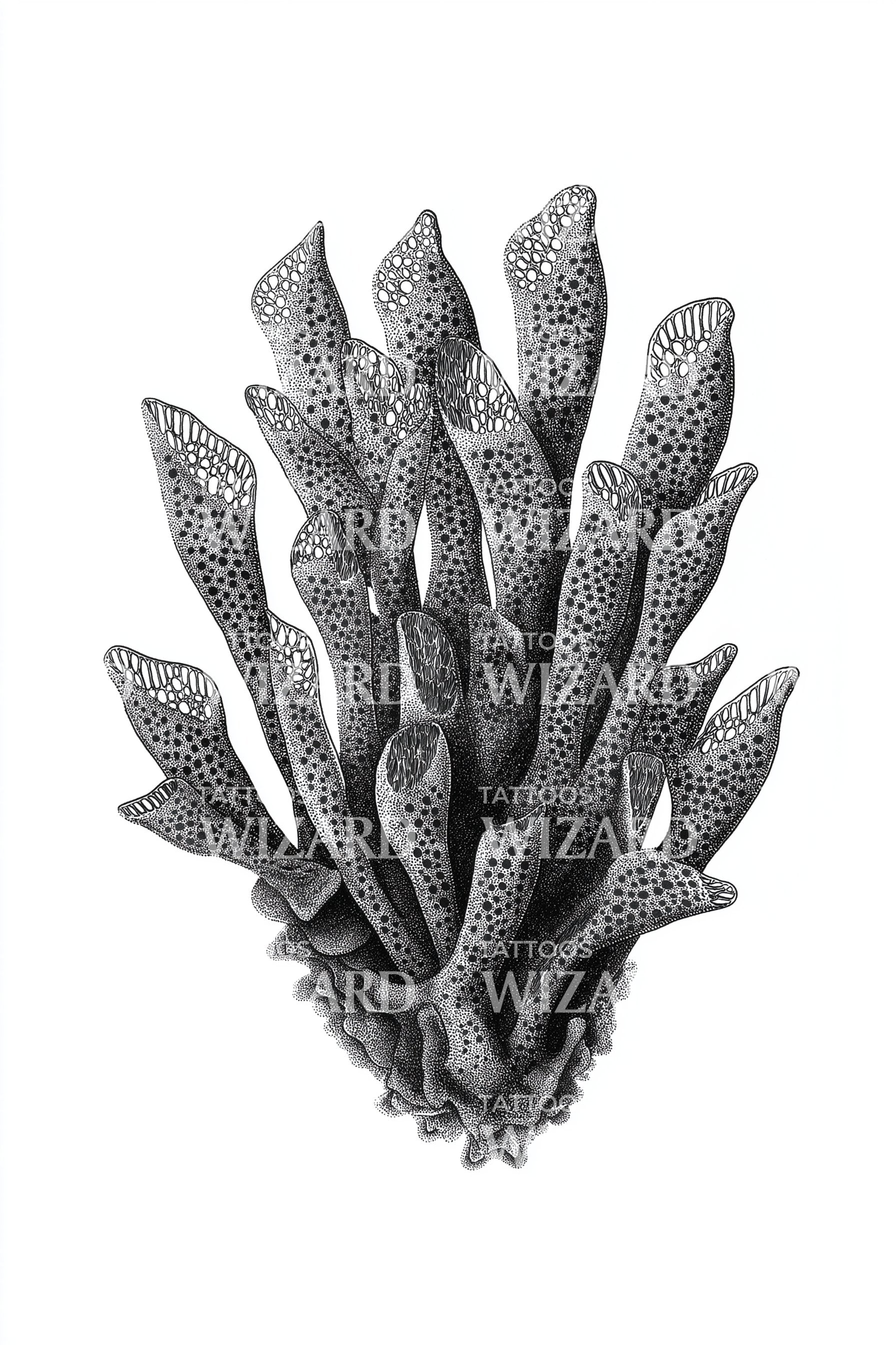 Kelp and seaweed rise like a vow from the ocean reef, a marine reminder that growth can be quiet and relentless. Dotwork turns salt and pressure into patience. Drawn to those who survive the undertow and still reach for light. Each dot, a tide kept.