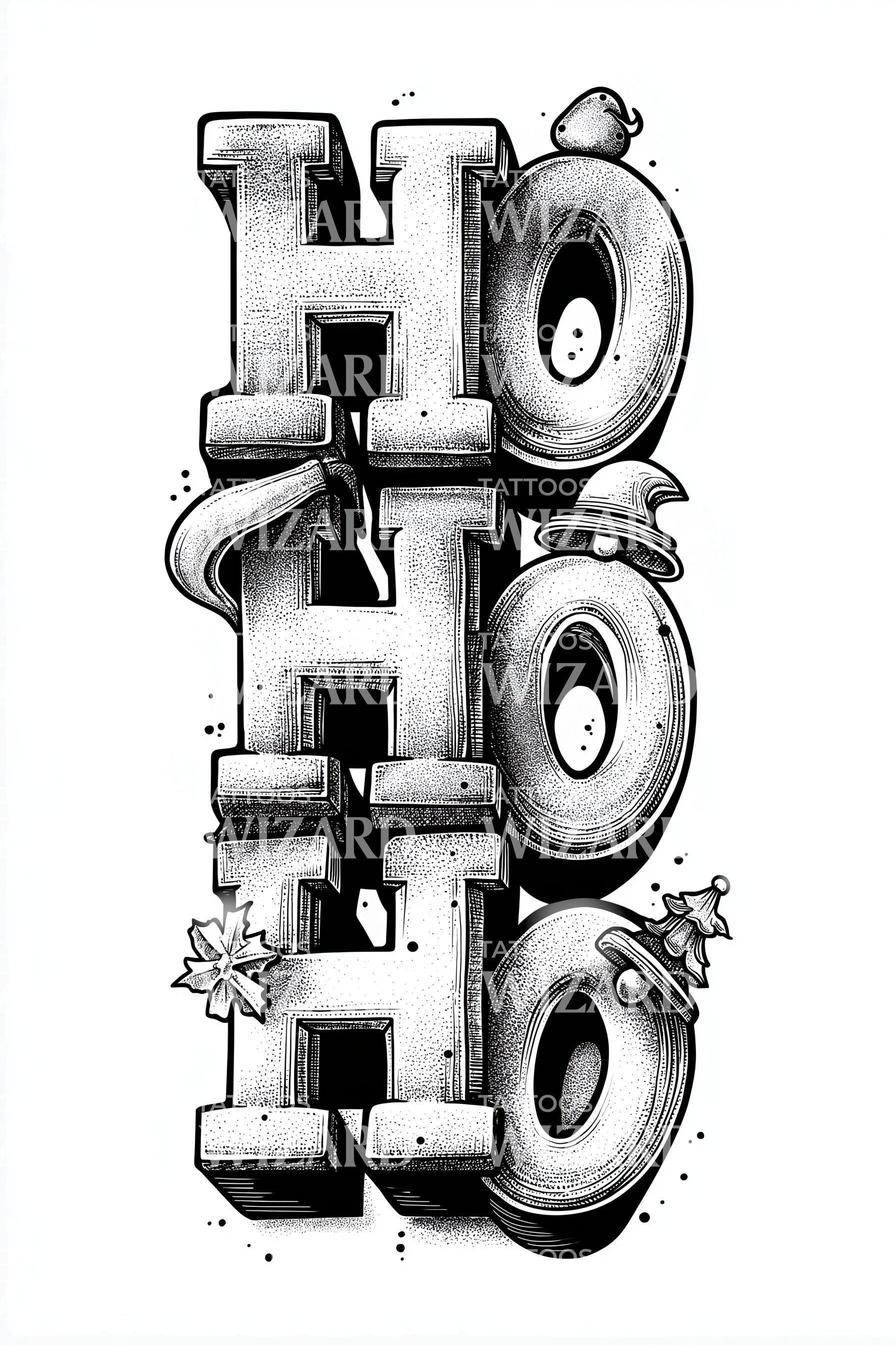 Bold block-letter HO HO HO rises like forged metal, stippled monochrome and shadowed in vintage signcraft, trimmed with bells, hat, and tiny tree. Holiday totem of joy and resilience, it rings with generosity and memory. Wearing it feels like warm armor, carrying Christmas wonder year-round with confident cheer.