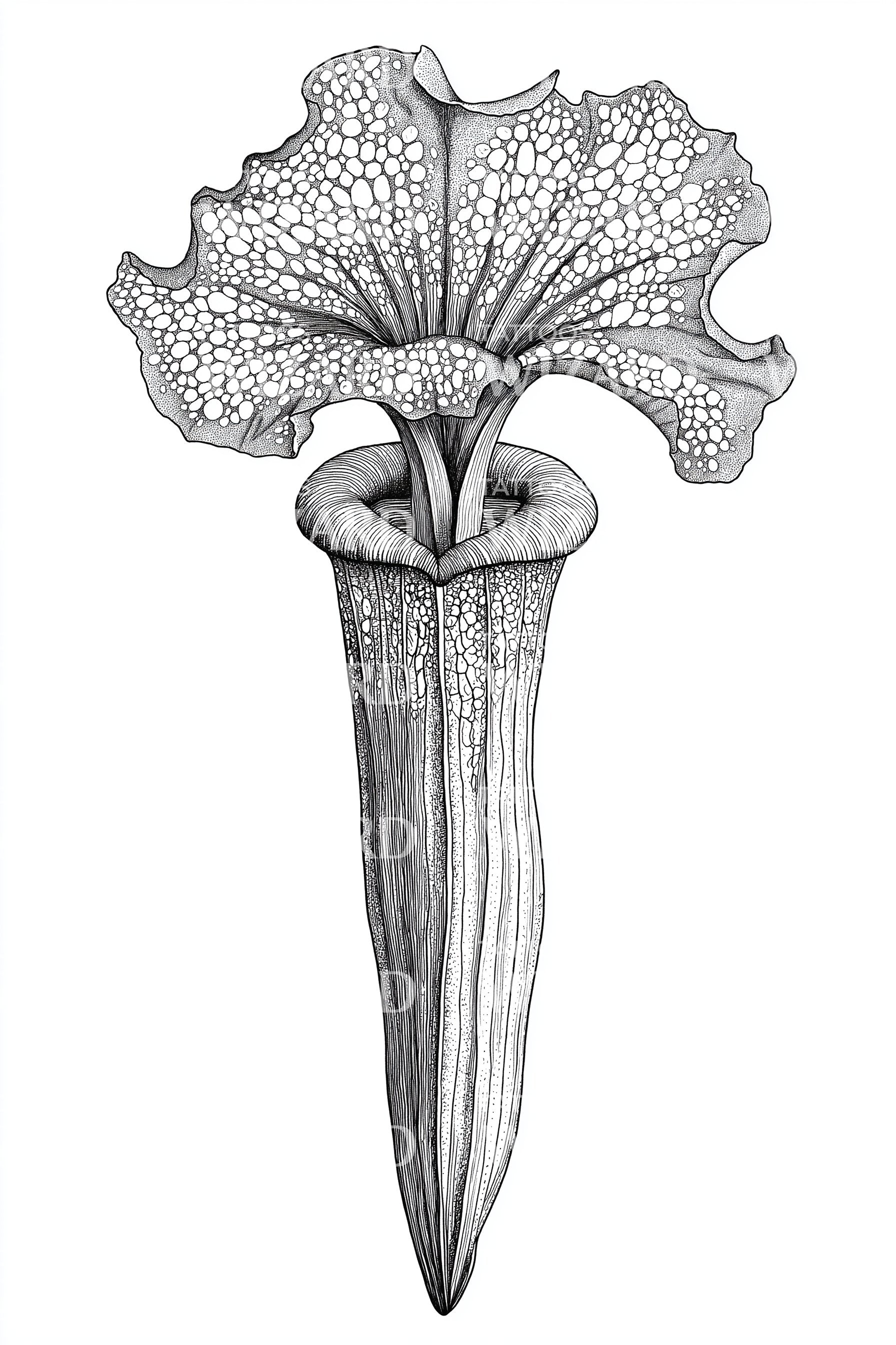 Pitcher and carnivorous botanical flora, an exotic vow in shaded black and grey: beauty that refuses to starve. Chosen by the one who turns hunger into discipline, softness into boundaries, and curiosity into power. Quietly, it whispers, “Let the world come closer.”