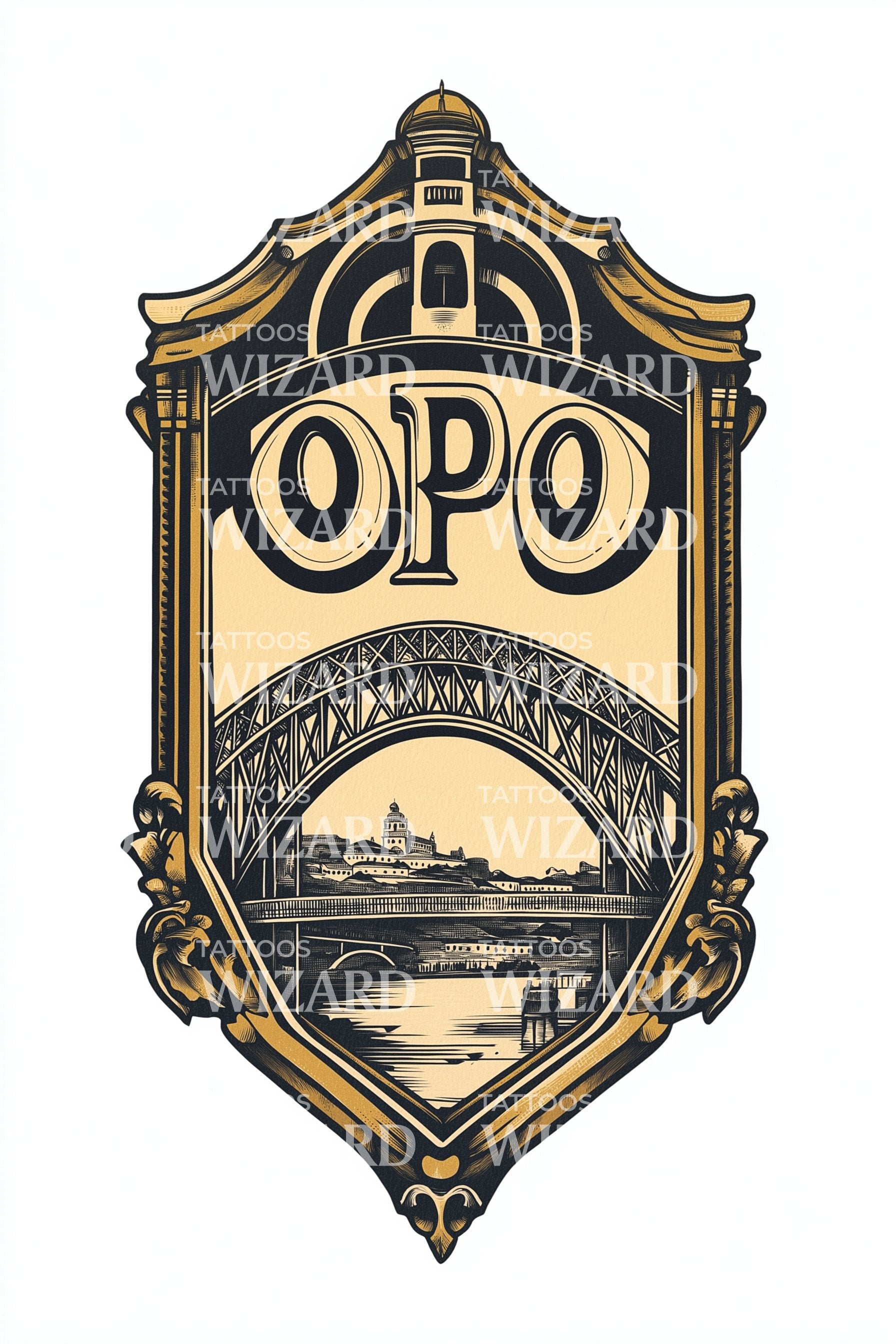 Ornate heraldic crest frames OPO in bold vintage lettering, arching over the iconic iron bridge and riverfront of Porto, Portugal. Lines echo steel ribs and tides, symbolizing passage, resilience, and return. Wearer carries home and horizon together, a steady compass of saudade, strength, and adventurous grace, everyday bravery.