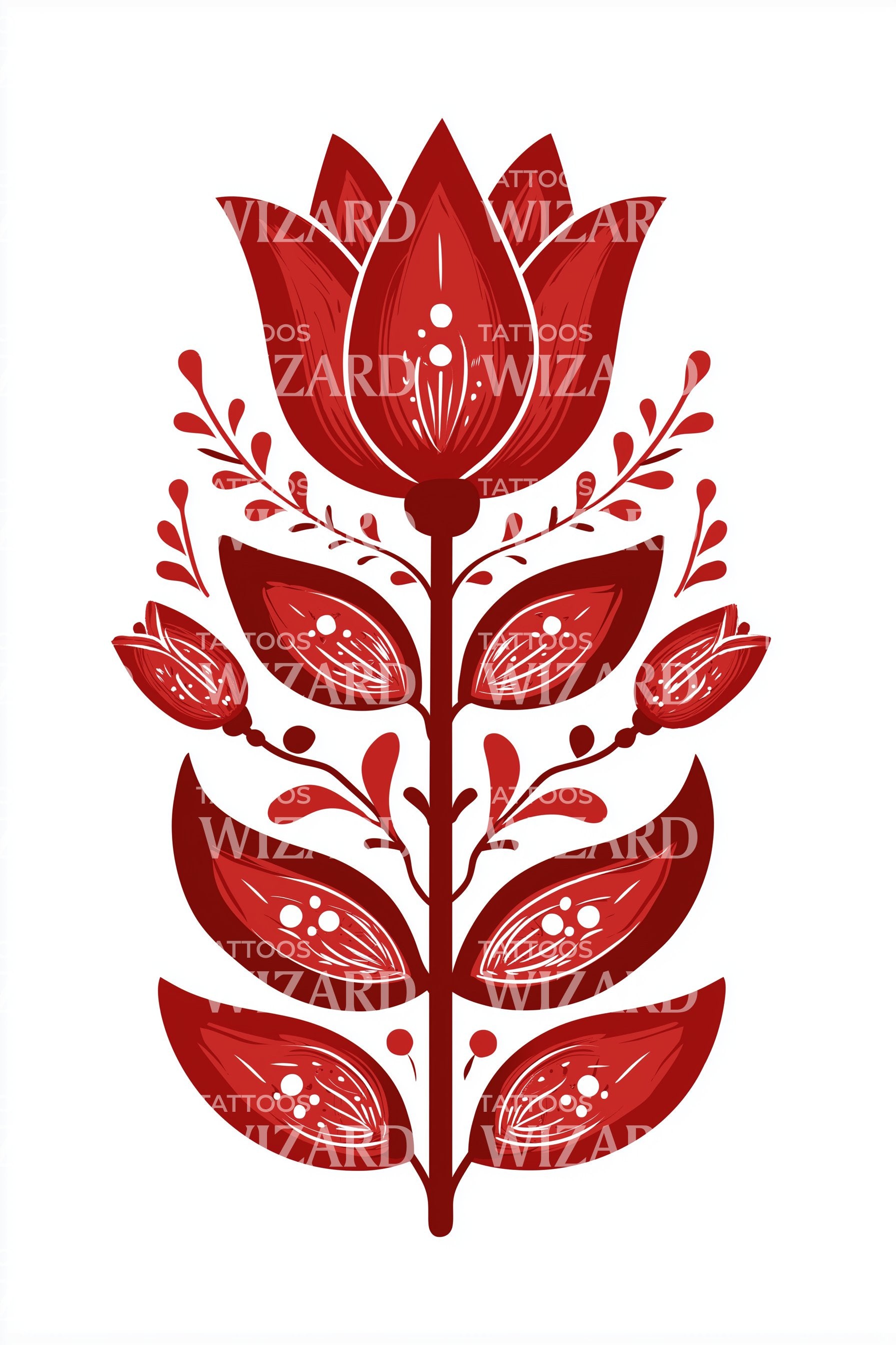 Crimson-red folk florals rise in a neotraditional totem: a central tulip crowned by ornate, patterned leaves and buds, etched with delicate dots and curls. This blooming column symbolizes lineage, renewal, and protective passion. Wearing it feels rooted and radiant, a steady heartbeat of courage flourishing on skin.